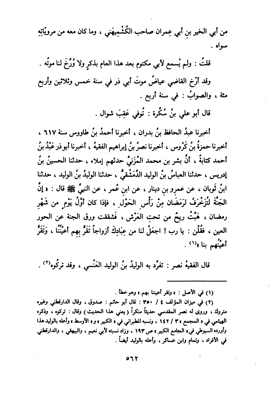 أَخْبَرَنَا عَبْدُ الحَافِظ بنُ بَدْرَان، أَخْبَرَنَا أَحْمَدُ بنُ طَاوُوس سَنَة 617، أَخْبَرَنَا حَمْزَةُ بنُ كَرّوس، أَخْبَرَنَا نَصْرُ بنُ إِبْرَاهِيْمَ الفَقِيْهُ، أَخْبَرَنَا أَبُو ذَر عَبْدُ بنُ أَحْمَدَ كِتَابَةً، أَنَّ بِشْر بن مُحَمَّدٍ المُزَنِيَّ حدثهُم إِمْلاَءً، حَدَّثَنَا الحُسَيْنُ بنُ إِدْرِيْسَ، حَدَّثَنَا العَبَّاسُ بنُ الوَلِيْدِ الدِّمَشْقِيُّ، حَدَّثَنَا الوَلِيْدُ بنُ الوَلِيْدِ، حَدَّثَنَا ابْنُ ثَوبَان، عَنْ عَمْرِو بنِ دِيْنَار، عَنِ ابْنِ عُمَرَ:
