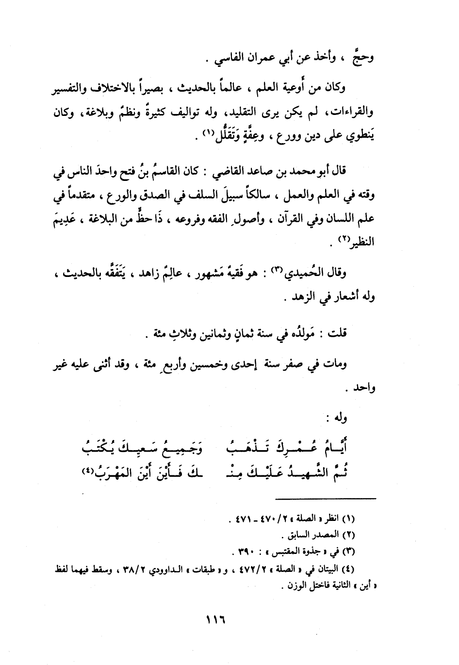 (4) البيتان في " الصلة " 2 / 472، و" طبقات " الداوودي 2 / 38، وسقط فيهما لفظ " أين " الثانية فاختل الوزن.
