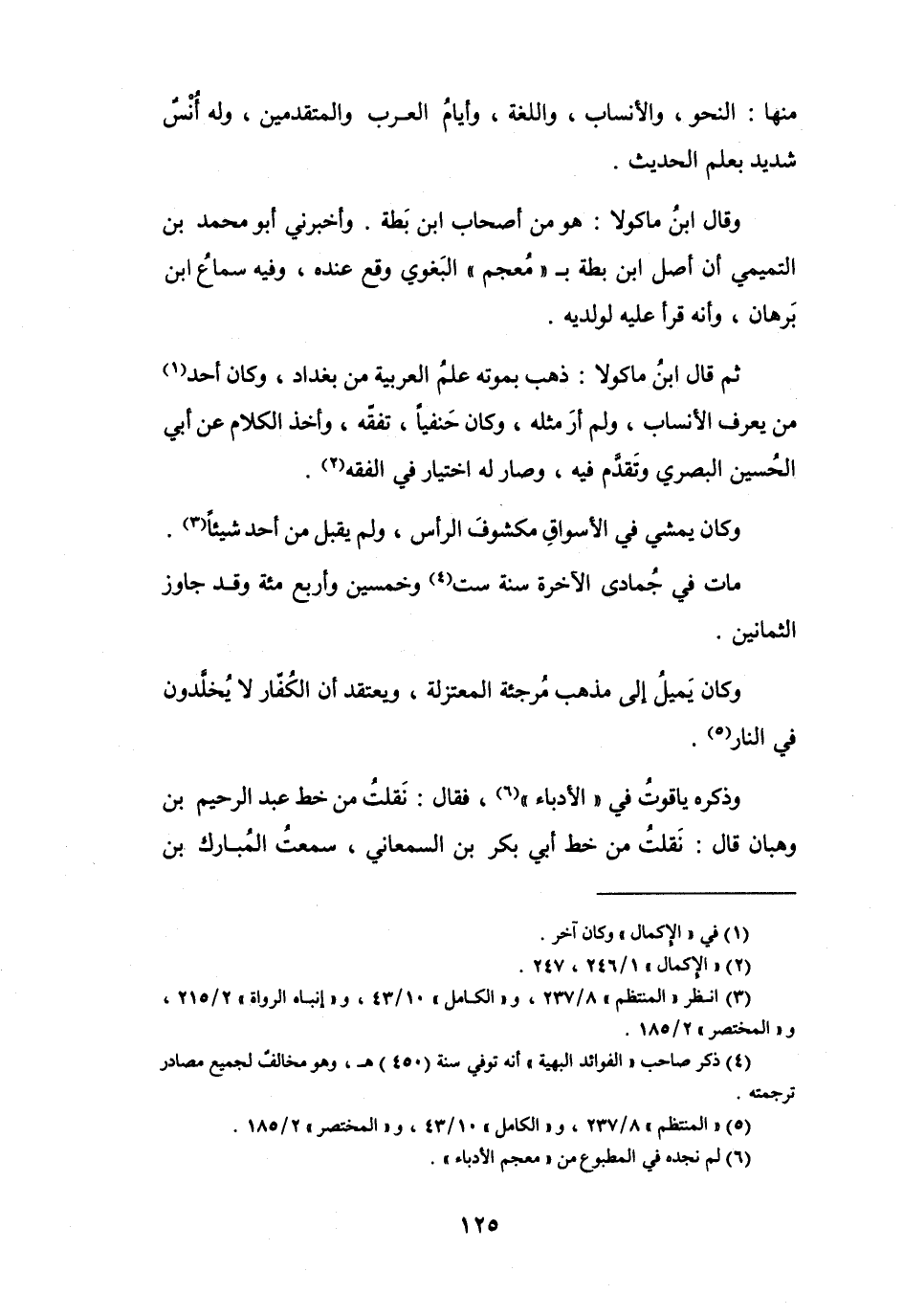 ثُمَّ قَالَ ابْنُ مَاكُوْلا: ذهب بِمَوْته علمُ العَرَبِيَّة مِنْ بَغْدَادَ، وَكَانَ أَحَدَ (1) مَنْ يَعرف الأَنسَاب، وَلَمْ أَرَ مِثْله، وَكَانَ حَنَفِيّاً، تَفَقَّهَ، وَأَخَذَ الكَلاَم، عَنْ أَبِي الحُسَيْنِ البَصْرِيّ وَتَقدَّم فِيْهِ، وَصَارَ لَهُ اخْتِيَارٌ فِي الفِقْه (2) .