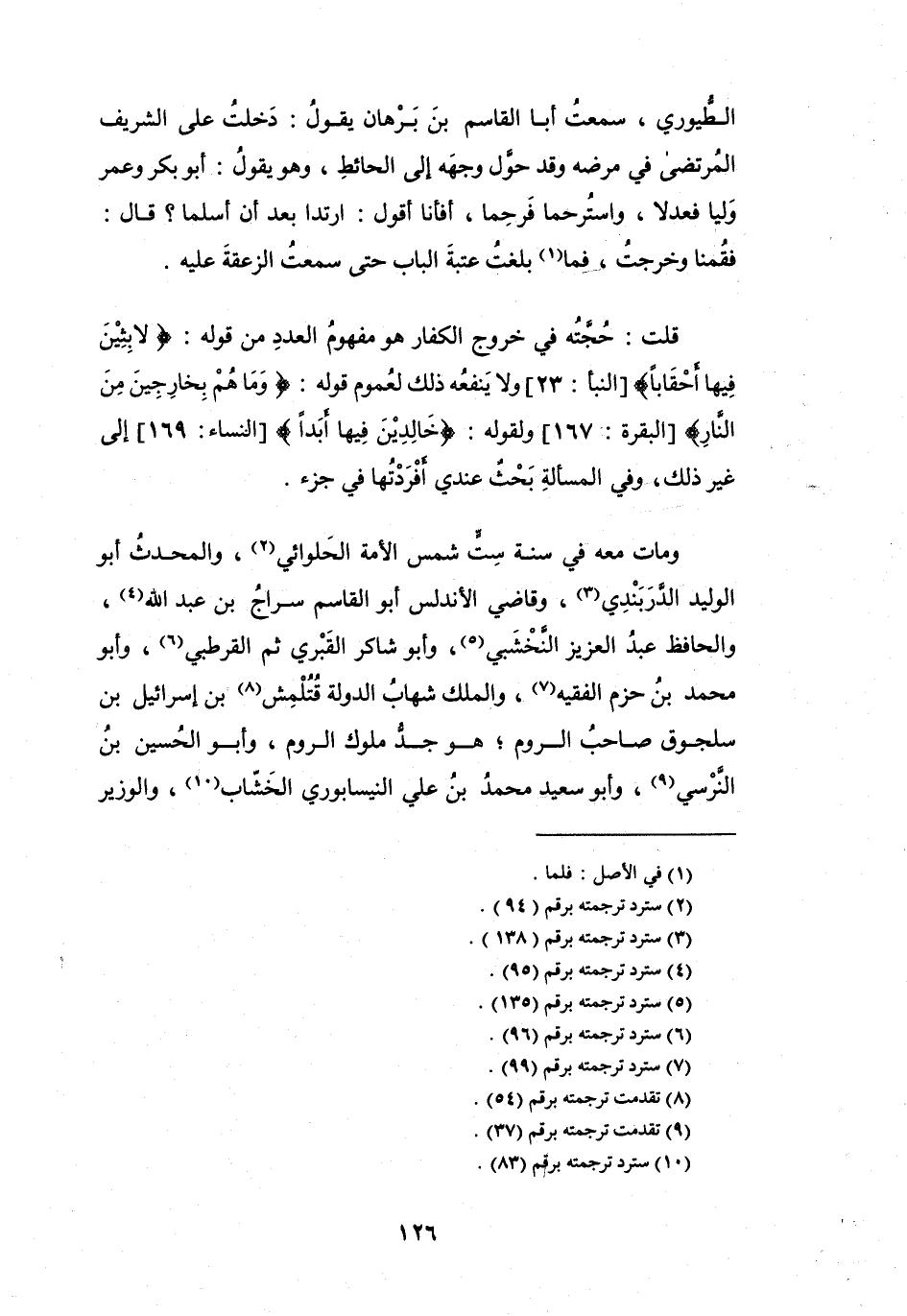 الطُّيورِي، سَمِعْتُ أَبَا القَاسِمِ بنَ بَرْهَان يَقُوْلُ: دَخَلتُ عَلَى الشَّرِيْف المُرْتَضَى فِي مَرَضِهِ وَقَدْ حوَّل وَجهه إِلَى الحَائِطِ وَهُوَ يَقُوْلُ: أَبُو بَكْرٍ وَعُمَرُ وَليَا فَعدلا، وَاسْتُرحمَا فَرحِمَا، أَفَأَنَا أَقُوْل: ارْتدَا بَعْدَ أَنْ أَسْلَمَا؟