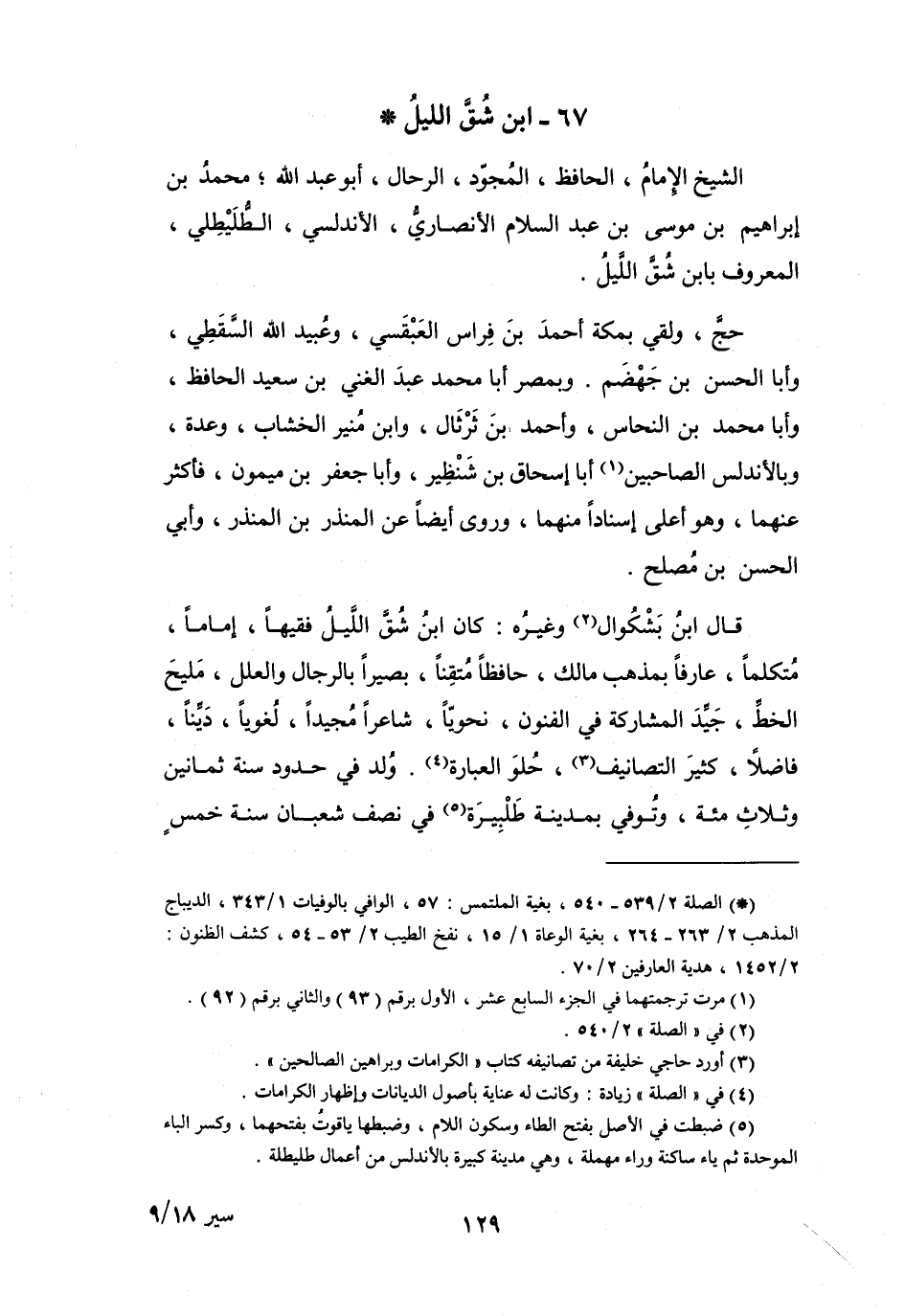 الشَّيْخُ، الإِمَامُ، الحَافِظُ، المُجَوِّدُ، الرَّحَّال، أَبُو عَبْدِ اللهِ مُحَمَّدُ بنُ إِبْرَاهِيْمَ بنِ مُوْسَى بنِ عَبْدِ السَّلاَمِ الأَنْصَارِيُّ، الأَنْدَلُسِيُّ، الطُّلَيْطِلِيُّ، المَعْرُوف بِابْنِ شُقَّ اللَّيْلُ.