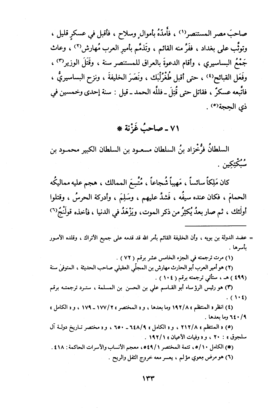 (5) " المنتظم " 8 / 212، و" الكامل " 9 / 648 - 650، و" مختصر تاريخ دولة آل سلجوق ": 20، و" وفيات الأعيان " 1 / 192.