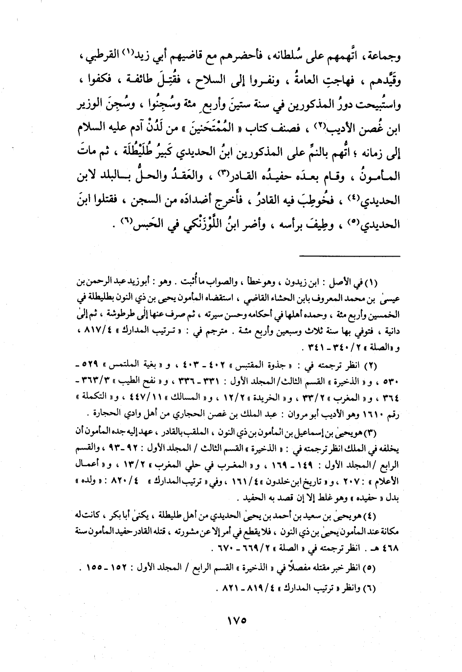 (4) هو يحيى بن سعيد بن أحمد بن يحيى الحديدي من أهل طليطلة، يكنى أبا بكر، كانت له مكانة عند المأمون يحيى بن ذي النون، فلا يقطع في أمر إلا عن مشورته، قتله القادر حفيد المأمون سنة 468 هـ.