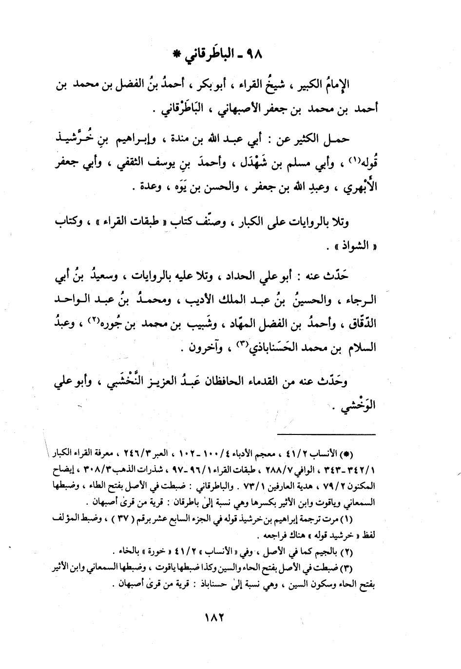 والباطرقاني: ضبطت في الأصل بفتح الطاء، وضبطها السمعاني وياقوت وابن الأثير بكسرها وهي نسبة إلى باطرقان: قرية من قرى أصبهان.