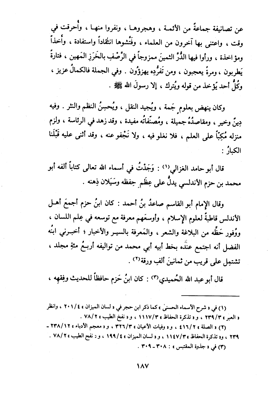 قَالَ أَبُو حَامِدٍ الغزَالِي (1) :وَجَدْتُ فِي أَسْمَاء الله تَعَالَى كِتَاباً أَلفه أَبُو مُحَمَّدٍ بنُ حَزْمٍ الأَنْدَلُسِيّ يَدلُّ عَلَى عِظَمِ حَفِظه وَسَيَلاَن ذِهنه.