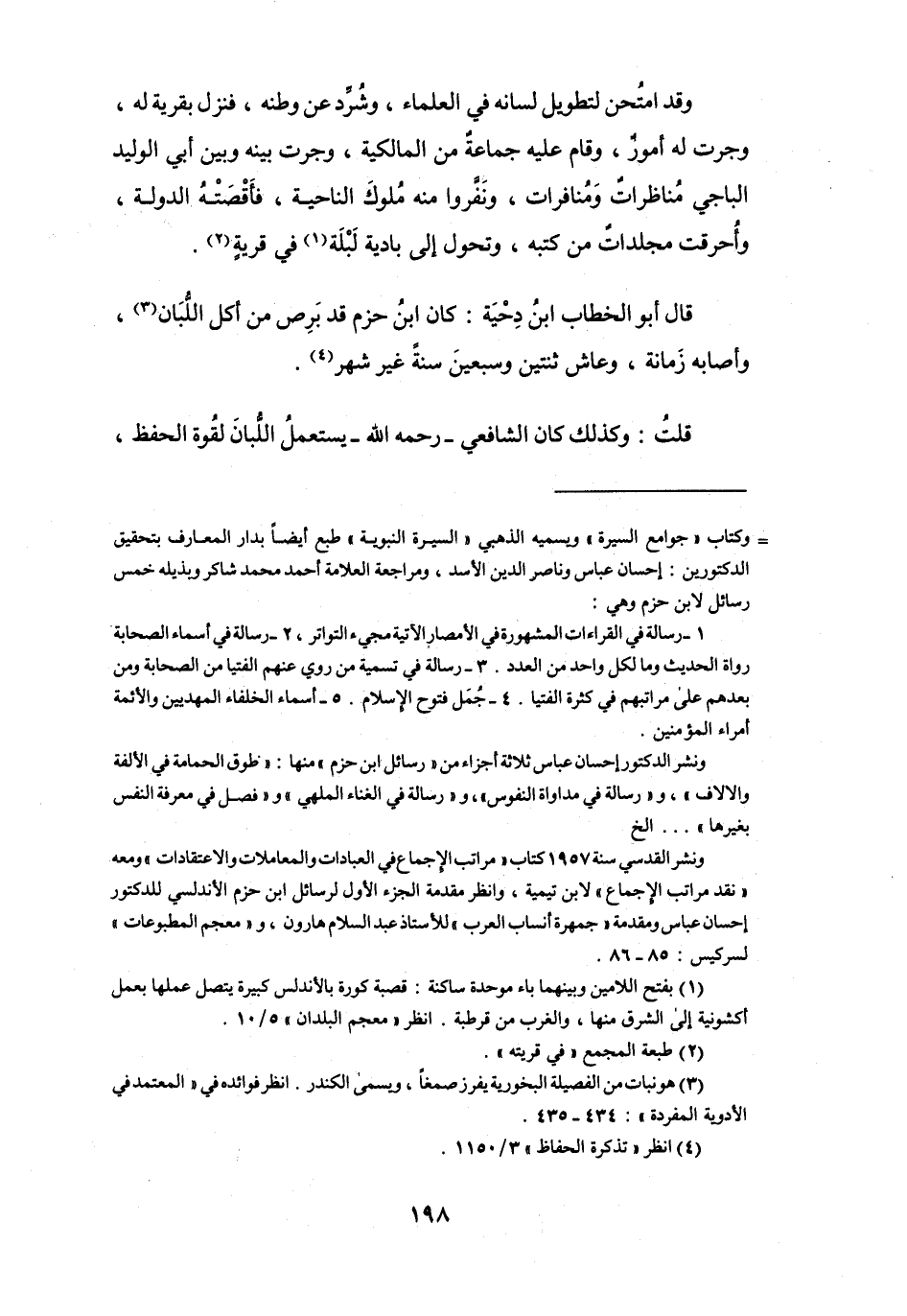 ونشر الدكتور إحسان عباس ثلاثة أجزاء من " رسائل ابن حزم " منها: " طوق الحمامة في الالفة والالاف "، و" رسالة في مداواة النفوس "، و" رسالة في الغناء الملهي " و" فصل في معرفة النفس بغيرها " ... الخ ونشر القدسي سنة 1957 كتاب " مراتب الاجماع في العبادات والمعاملات والاعتقادات " ومعه " نقد مراتب الاجماع " لابن تيمية، وانظر مقدمة الجزء الأول لرسائل ابن حزم الأندلسي للدكتور إحسان عباس ومقدمة " جمهرة أنساب العرب " للاستاذ عبد السلام هارون، و" معجم المطبوعات " لسركيس: 85 - 86.