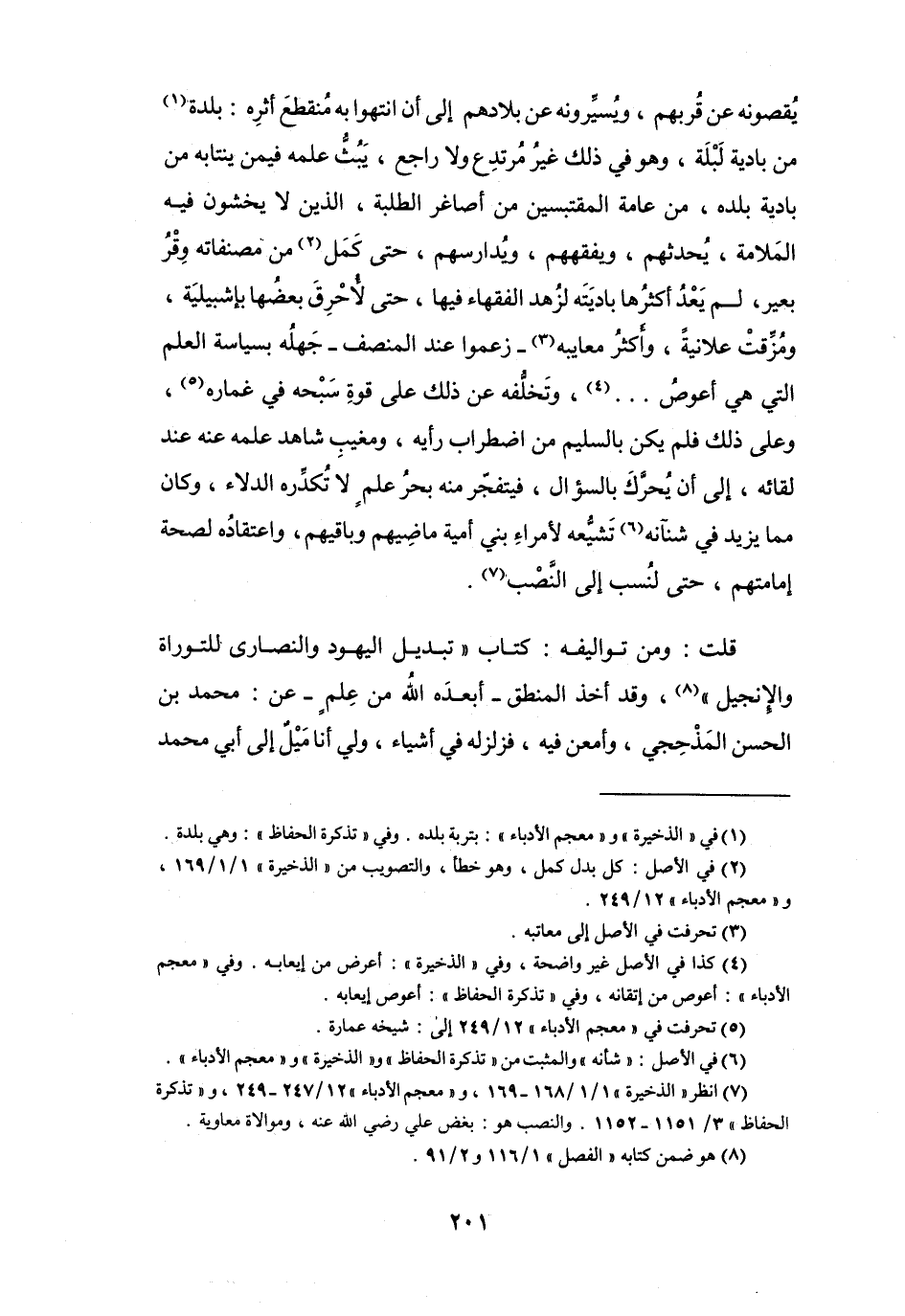 قُلْتُ: وَمِنْ تَوَالِيفه: كِتَاب (تَبديل اليَهُوْد وَالنَّصَارَى لِلتَّورَاة وَالإِنجيل (8)) ، وَقَدْ أَخَذَ الْمنطق - أَبعدَهُ الله مِنْ عِلمٍ - عَنْ: مُحَمَّدِ بنِ الحَسَنِ المَذْحِجِيّ، وَأَمعَنَ فِيْهِ، فَزلزله فِي أَشيَاء، وَلِي أَنَا مَيْلٌ إِلَى أَبِي مُحَمَّدٍ