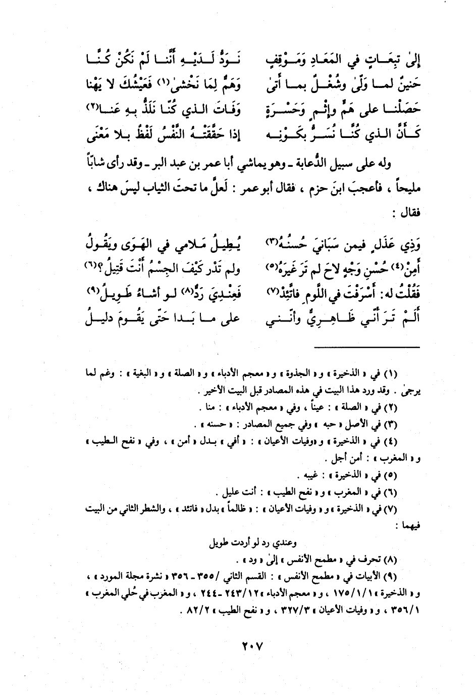 (9) الابيات في " مطمح الانفس ": القسم الثاني / 355 - 356 " نشرة مجلة المورد "، و" الذخيرة " 1 / 1 / 175، و" معجم الأدباء " 12 / 243 - 244، و" المغرب في حلي المغرب " 1 / 356، و" وفيات الأعيان " 3 / 327، و" نفح الطيب " 2 / 82.