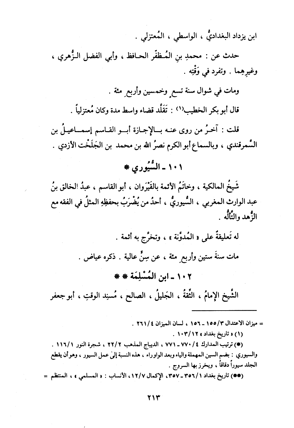 (* *) تاريخ بغداد 1 / 356 - 357، الإكمال 7 / 12، الأنساب: " المسلمي "، المنتظم =