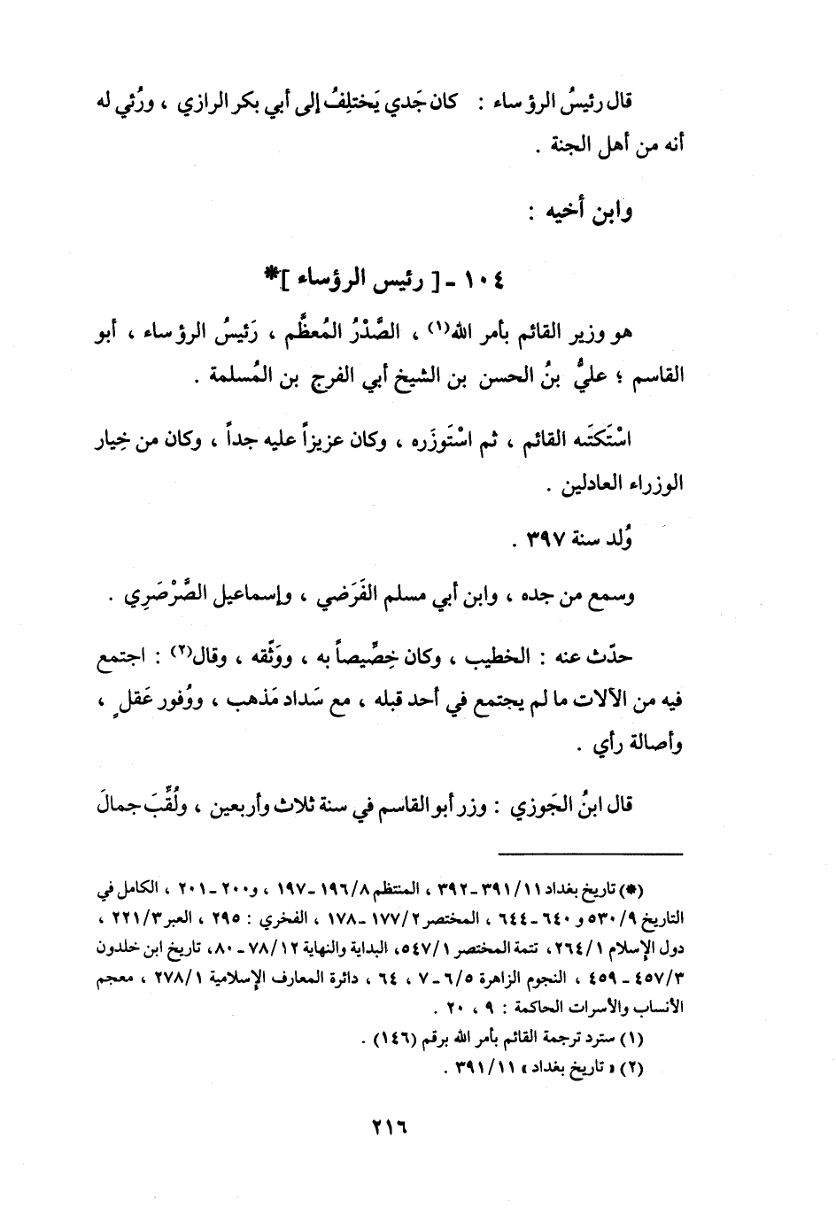 104 - رَئِيْسُ الرُّؤَسَاءِ عَلِيُّ بنُ الحَسَنِ بنِ أَبِي الفَرَجِ بنِ المُسْلِمَةِ *