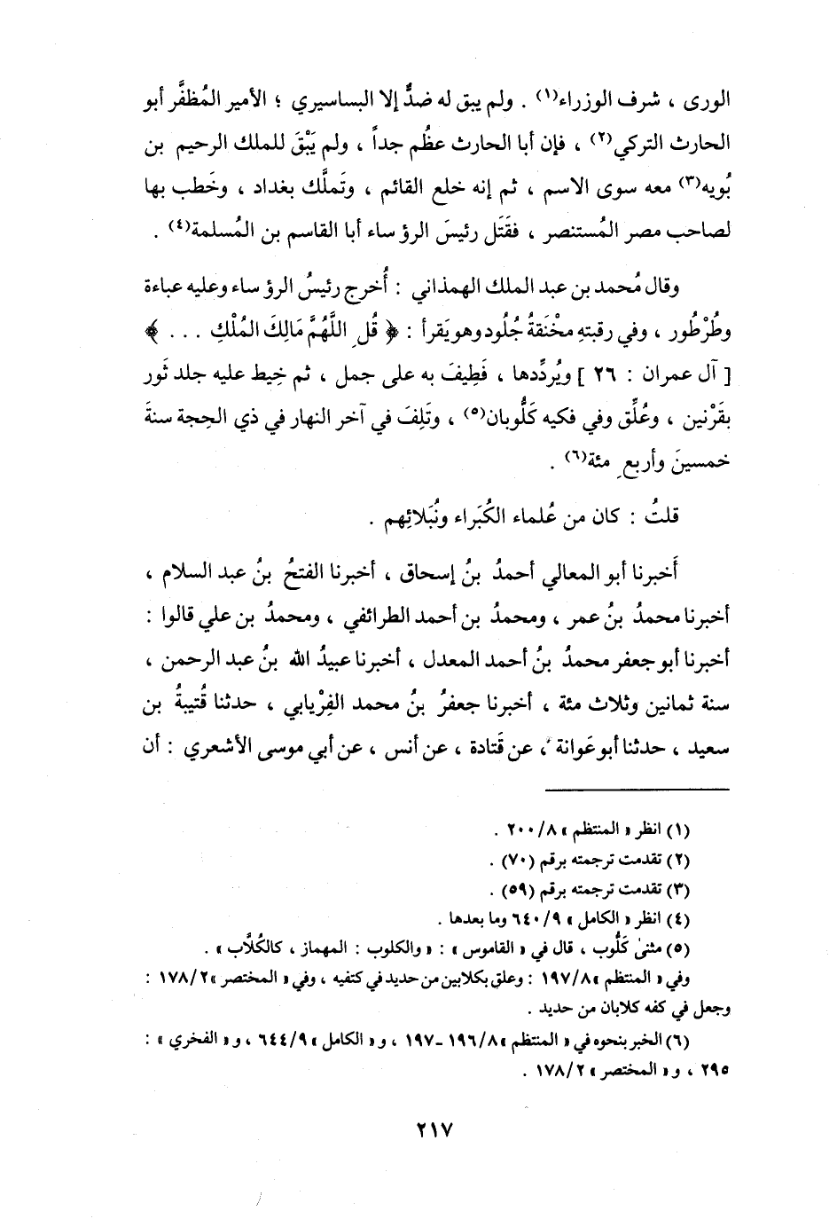 وَقَالَ مُحَمَّدُ بنُ عَبْدِ المَلِكِ الهَمَذَانِيّ: أُخرج رَئِيْسُ الرُّؤَسَاء وَعَلَيْهِ عبَاءة وَطُرْطُور، وَفِي رَقبتِهِ مخْنَقَةُ جُلُود وَهُوَ يَقرَأَ: {قُلِ اللَّهُمَّ مَالِكَ المُلْكِ ... } [آل عِمْرَان:26] وَيُرَدِّدهَا، فَطِيْفَ بِهِ عَلَى جمل، ثُمَّ خِيط عَلَيْهِ جلد ثَوْر بقرنِيْنَ، وَعُلِّقَ وَفِي فَكَّيه كَلُّوبَان (5) ، وَتَلِفَ فِي آخِر النَّهَار فِي ذِي الحِجَّةِ سَنَةَ خَمْسِيْنَ وَأَرْبَعِ مائَة (6) .
