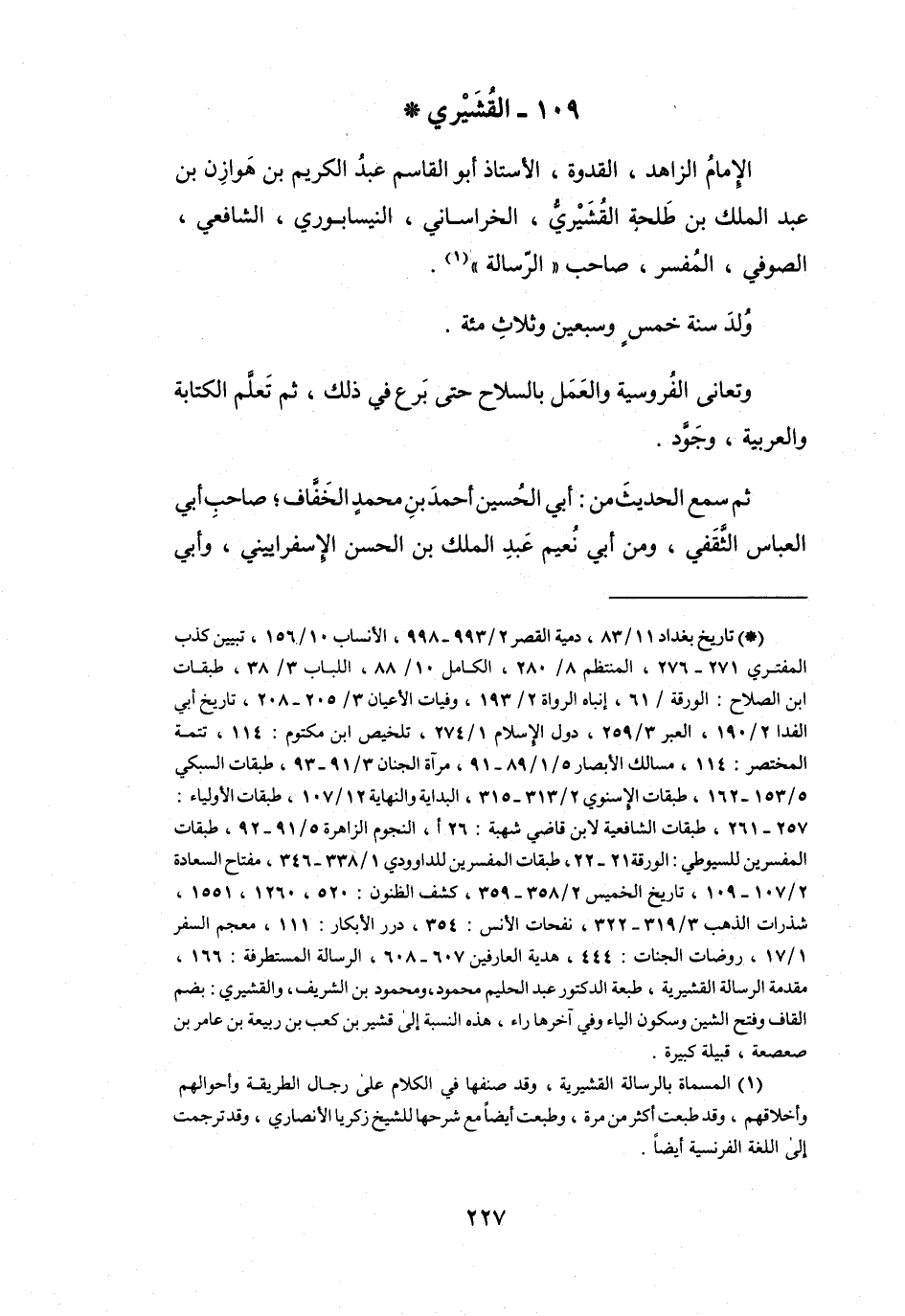 الإِمَامُ، الزَّاهِدُ، القُدْوَةُ، الأُسْتَاذُ، أَبُو القَاسِمِ عَبْدُ الكَرِيْمِ بنُ هَوَازِن بنِ عَبْدِ المَلِكِ بنِ طَلْحَةَ القُشَيْرِيُّ، الخُرَاسَانِيُّ، النَّيْسَابُوْرِيُّ، الشَّافِعِيُّ، الصُّوْفِيُّ، المُفَسِّرُ، صَاحِبُ (الرِّسَالَةِ (1)) .
