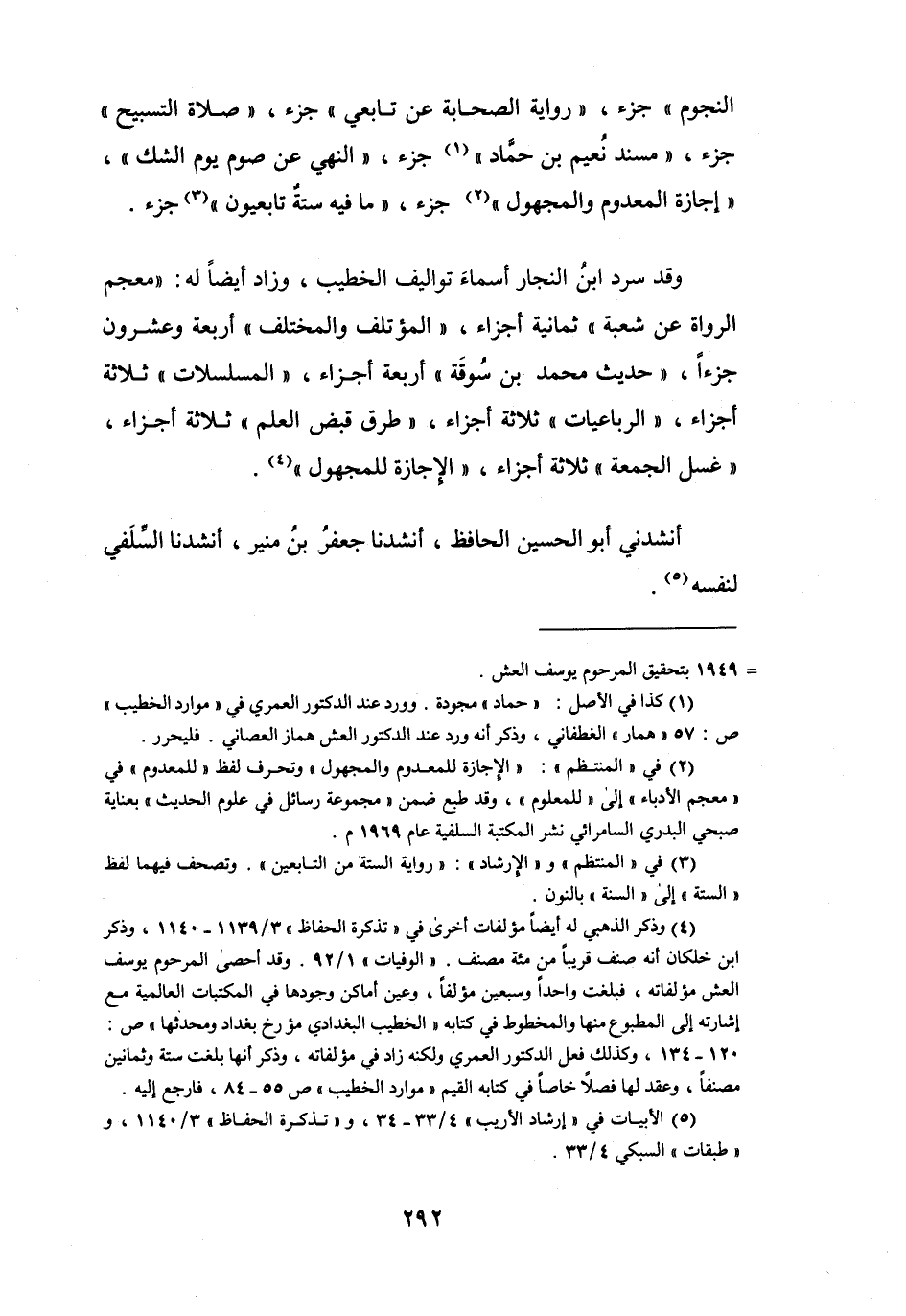 (2) في " المنتظم ": " الاجازة للمعدوم والمجهول " وتحرف لفظ " للمعدوم " في " معجم الأدباء " إلى " للمعلوم "، وقد طبع ضمن " مجموعة رسائل في علوم الحديث " بعناية صبحي البدري السامرائي نشر المكتبة السلفية عام 1969 م.