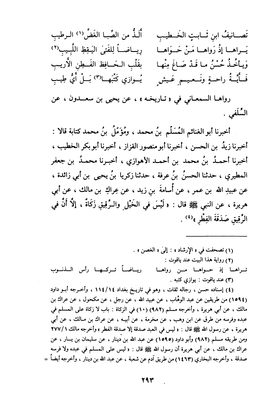تَصَانِيْفُ ابْنِ ثَابِتٍ الخَطِيْبِ ... أَلَذُّ مِنَ الصِّبَا الغَضِّ (1) الرَّطِيْبِ