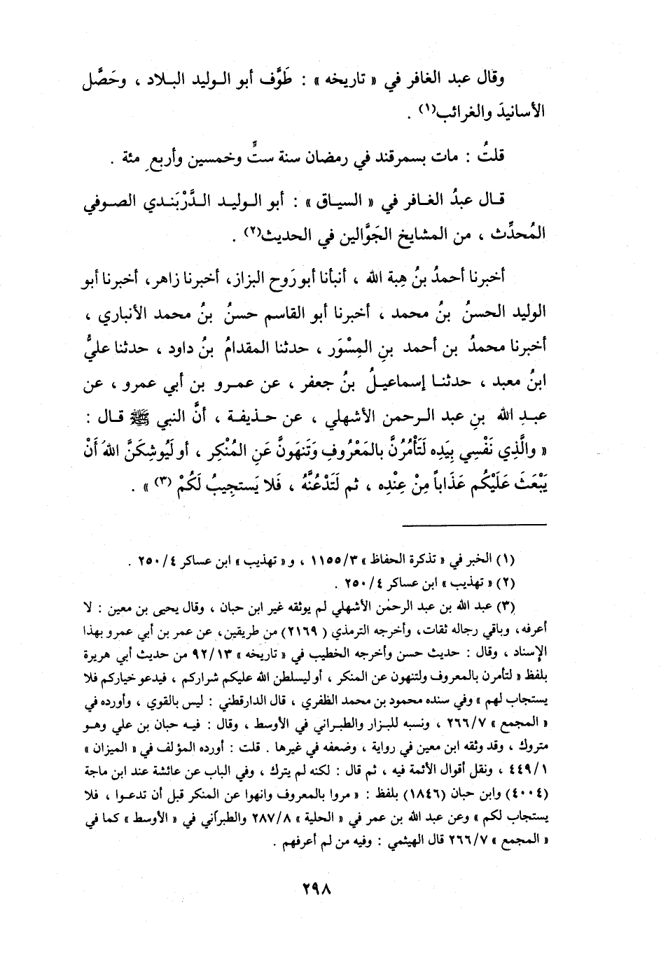 أَنَّ النَّبِيَّ - صَلَّى اللَّهُ عَلَيْهِ وَسَلَّمَ - قَالَ: (وَالَّذِي نَفْسِي بِيَدِهِ لَتَأْمُرُنَّ بِالمَعْرُوْفِ وَتَنْهَونَّ عَنِ المُنْكَر، أَوْ ليُوْشِكَنَّ الله أَنْ يَبْعَثَ عَلَيْكُم عَذَاباً مِنْ عِنْدِهِ، ثُمَّ لِتَدْعُنَّهُ فَلاَ يَسْتَجِيْبُ لَكُمْ) (3) .