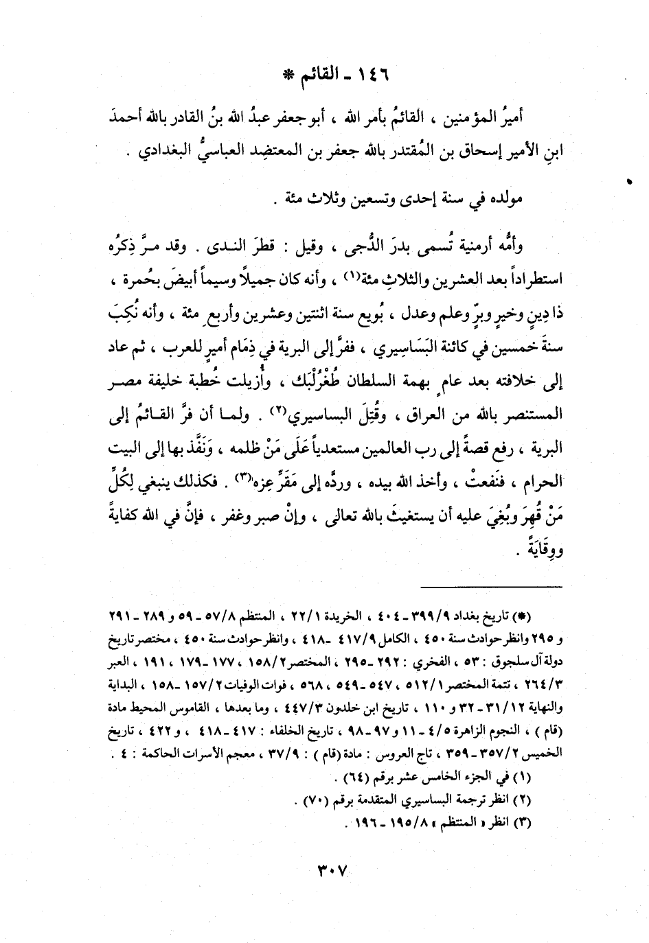 (*) تاريخ بغداد 9 / 399 - 404، الخريدة 1 / 22، المنتظم 8 / 57 - 59 و289 - 291 و295 وانظر حوادث سنة 450، الكامل 9 / 417 - 418، وانظر حوادث سنة 450، مختصر تاريخ دولة آل سلجوق: 53، الفخري: 292 - 295، المختصر 2 / 158، 177 - 179، 191، العبر 3 / 264، تتمة المختصر 1 / 512، 547 - 549، 568، فوات الوفيات 2 / 157 - 158، البداية والنهاية 12 / 31 - 32 و110، تاريخ ابن خلدون 3 / 447، وما بعدها، القاموس المحيط مادة (قام) ، النجوم الزاهرة 5 / 4 - 11 و97 - 98، تاريخ الخلفاء: 417 - 418، و422، تاريخ الخميس 2 / 357 - 359، تاج العروس: مادة (قام) : 9 / 37، معجم الاسرات الحاكمة: 4.