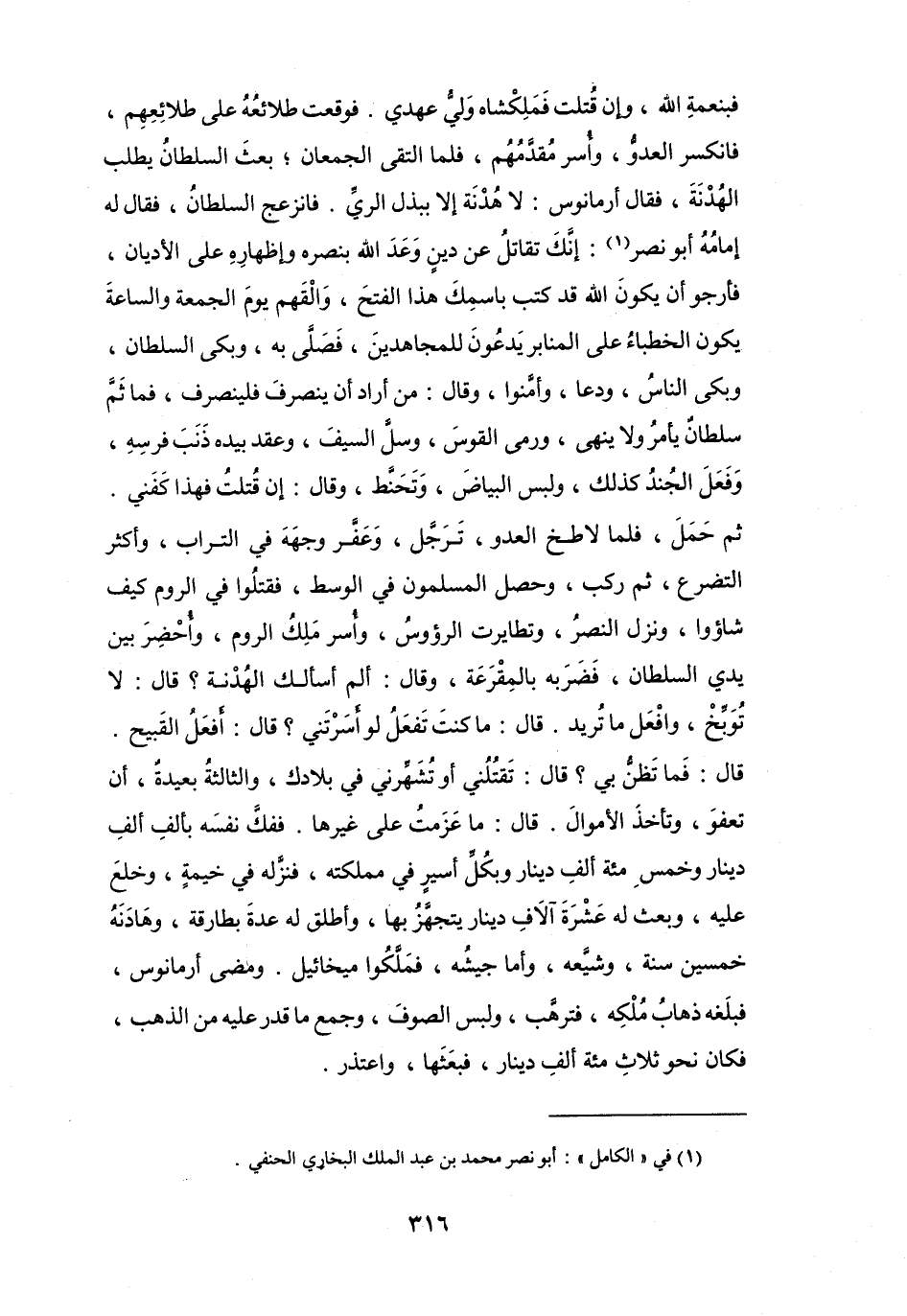 فَفَكَّ نَفْسَهُ بِأَلفِ أَلفِ دِيْنَار وَخَمْس مائَة أَلْفِ دِيْنَار وَبِكُلِّ أَسيرٍ فِي مَمْلَكَته، فَنَزَّله فِي خيمَةٍ، وَخلعَ عَلَيْهِ، وَبَعَثَ لَهُ عَشْرَةَ آلاَفِ دِيْنَار يَتَجَهَّز بِهَا، وَأَطلق لَهُ عِدَّة بَطَارِقَة، وَهَادَنَهُ خَمْسِيْنَ سَنَةً، وَشيَّعه، وَأَمَّا جَيْشُهُ، فَمَلَّكُوا مِيخَائِيْل.