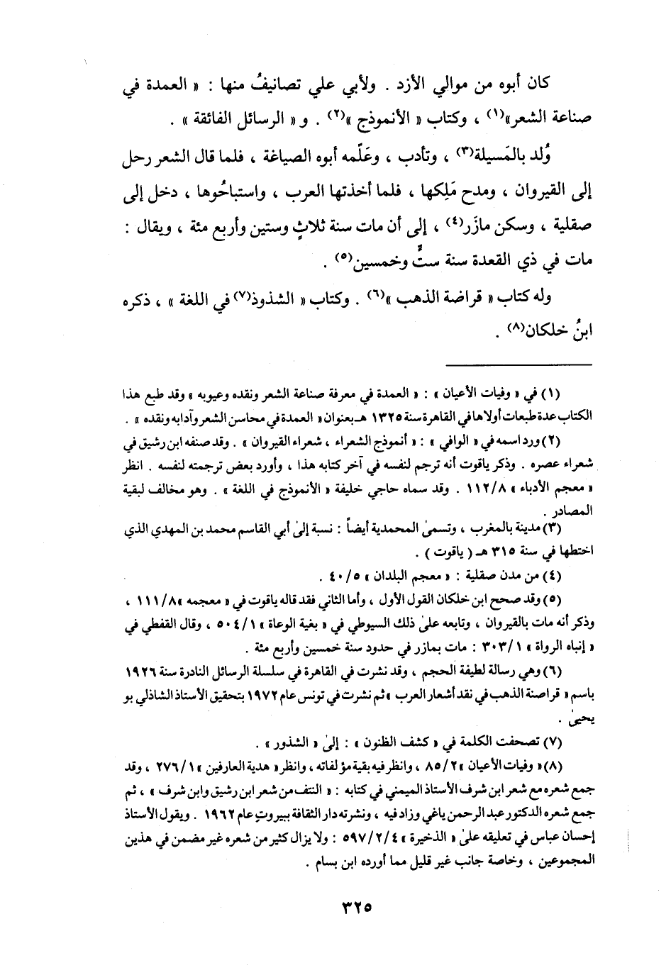 (1) في " وفيات الأعيان ": " العمدة في معرفة صناعة الشعر ونقده وعيوبه " وقد طبع هذا الكتاب عدة طبعات أولاها في القاهرة سنة 1325 هـ بعنوان " العمدة في محاسن الشعر وآدابه ونقده ".