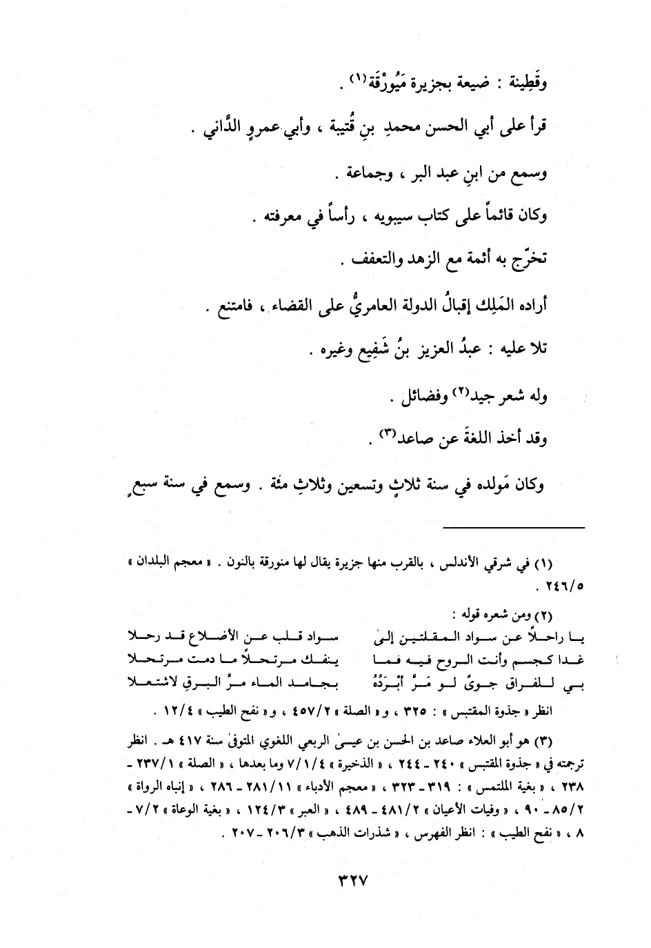 انظر ترجمته في " جذوة المقتبس " 240 - 244، " الذخيرة " 4 / 1 / 7 وما بعدها، " الصلة " 1 / 237 238، " بغية الملتمس ": 319 - 323، " معجم الأدباء " 11 / 281 - 286، " إنباه الرواة " 2 / 85 - 90، " وفيات الأعيان " 2 / 481 - 489، " العبر " 3 / 124، " بغية الوعاة " 2 / 7 - 8، " نفح الطيب ": انظر الفهرس، " شذرات الذهب " 3 / 206 - 207.