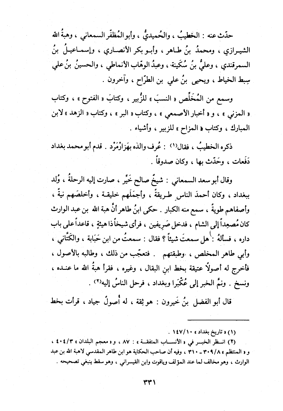 (2) انظر الخبر في " الأنساب المتفقة ": 87، و" معجم البلدان " 3 / 404، و" المنتظم " 8 / 309 - 310، وفيه أن صاحب الحكاية هو ابن طاهر المقدسي لا هبة الله بن عبد الوارث، وهو مخالف لما عند المؤلف وياقوت وابن القيسراني، وهو سقط ينبغي تصحيحه.