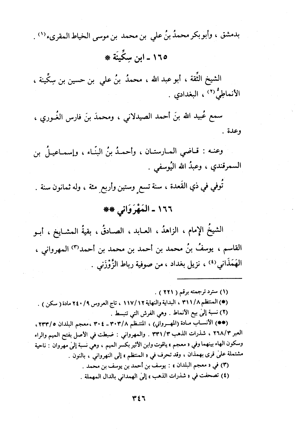 والمهرواني: ضبطت في الأصل بفتح الميم والراء وسكون الهاء بينهما وفي " معجم " ياقوت وابن الأثير بكسر الميم، وهي نسبة إلى مهروان: ناحية مشتملة على قرى بهمذان، وقد تحرف في " المنتظم " إلى النهرواني، بالنون.