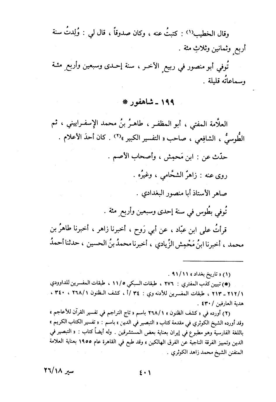 199 - شَاهْفُوْرُ أَبُو المُظَفَّرِ طَاهِرُ بنُ مُحَمَّدٍ الإِسْفَرَايِيْنِيُّ *