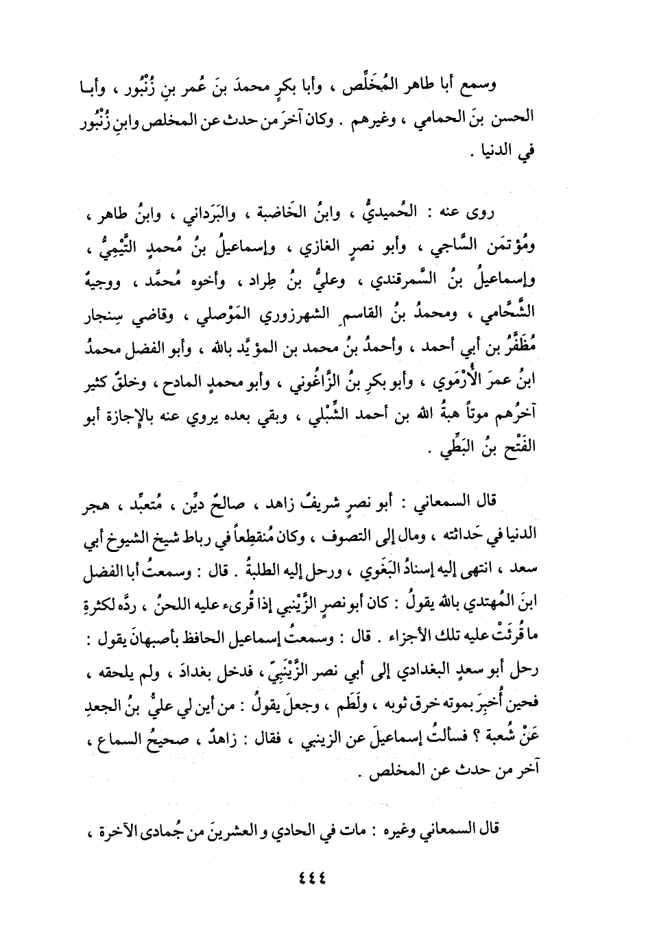 قَالَ: وَسَمِعْتُ إِسْمَاعِيْل الحَافِظ بِأَصْبَهَانَ يَقُوْلُ: رَحل أَبُو سَعْدٍ البَغْدَادِيّ إِلَى أَبِي نَصْرٍ الزَّيْنَبِيّ، فَدَخَلَ بَغْدَادَ، وَلَمْ يَلحقه، فَحين أُخْبِرَ بِمَوْته خرق ثَوْبه، وَلَطَمَ، وَجَعَلَ يَقُوْلُ: مِنْ أَيْنَ لِي عَلِيُّ بنُ الجَعْدِ، عَنْ شُعْبَةَ؟ فَسَأَلتُ إِسْمَاعِيْلَ عَنِ الزَّيْنَبِيّ، فَقَالَ زَاهِدٌ، صَحِيْحُ السَّمَاع، آخر مَنْ حَدَّثَ عَنِ المُخَلِّص.