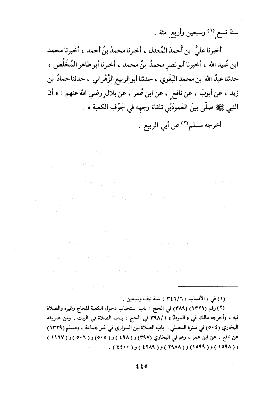 (2) رقم (1329) (389) في الحج: باب استحباب دخول الكعبة للحاج وغيره والصلاة فيه، وأخرجه مالك في " الموطأ " 1 / 398 في الحج: باب الصلاة في البيت، ومن طريقه البخاري (504) في سترة المصلي: باب الصلاة بين السواري في غير جماعة، ومسلم (1329) عن نافع، عن ابن عمر، وهو في البخاري (397) و (498) و (505) و (506) و (1167) و (1598) و (1599) و (2988) و (4289) و (4400) .