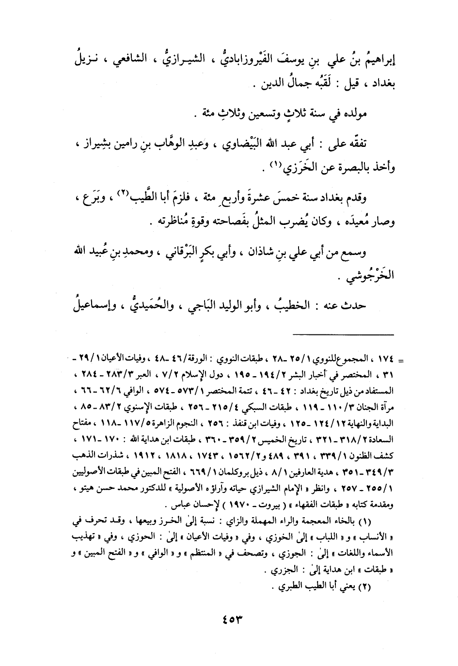 = 174، المجموع للنووي 1 / 25 - 28، طبقات النووي: الورقة / 46 - 48، وفيات الأعيان 1 / 29 - 31، المختصر في أخبار البشر 2 / 194 - 195، دول الإسلام 2 / 7، العبر 3 / 283 - 284، المستفاد من ذيل تاريخ بغداد: 42 - 46، تتمة المختصر 1 / 573 - 574، الوافي 6 / 62 - 66، مرآة الجنان 3 / 110 - 119، طبقات السبكي 4 / 215 - 256، طبقات الاسنوي 2 / 83 - 85، البداية والنهاية 12 / 124 - 125، وفيات ابن قنفذ: 256، النجوم الزاهرة 5 / 117 - 118، مفتاح السعادة 2 / 318 - 321، تاريخ الخميس 2 / 359 - 360، طبقات ابن هداية الله: 170 - 171، كشف الظنون 1 / 339، 391، 489 و2 / 1562، 1743، 1818، 1912، شذرات الذهب 3 / 349 - 351، هدية العارفين 1 / 8، ذيل بروكلمان 1 / 669، الفتح المبين في طبقات الاصوليين 1 / 255 - 257، وانظر " الامام الشيرازي حياته وآراؤه الاصولية " للدكتور محمد حسن هيتو، ومقدمة كتابه " طبقات الفقهاء " (بيروت - 1970) لاحسان عباس.