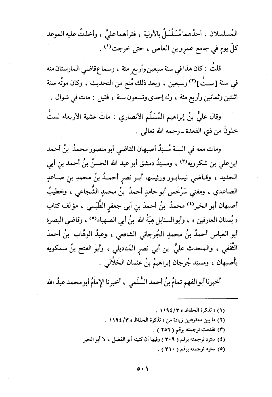 وَمَاتَ مَعَهُ فِي السَّنَةِ: مُسْنِدُ أَصْبَهَان القَاضِي أَبُو مَنْصُوْرٍ مُحَمَّدُ بنُ أَحْمَدَ بنِ عَلِيِّ بنِ شكرويه (3) ، وَمُسْنِدُ دِمَشْق أَبُو عَبْدِ اللهِ الحَسَنُ بنُ أَحْمَدَ بنِ أَبِي الحَدِيْد، وَقَاضِي نَيْسَابُوْر وَرَئِيْسهَا أَبُو نَصْرٍ أَحْمَدُ بنُ مُحَمَّدِ بنِ صَاعِدٍ الصَّاعديّ، وَمُفْتِي سَرْخَس أَبُو حَامِدٍ أَحْمَدُ بنُ مُحَمَّدٍ الشُّجَاعِيّ، وَخطيبُ أَصْبَهَان أَبُو الخَيْرِ (4) مُحَمَّدُ بنُ أَحْمَدَ بنِ أَبِي جَعْفَرٍ الطَّبَسِيّ، مُؤَلّف كِتَاب (بستَان العَارِفِيْن) ، وَأَبُو السنَابِل هِبَةُ اللهِ بنُ أَبِي الصَّهْبَاء (5) ، وَقَاضِي البَصْرَةِ أَبُو العَبَّاسِ أَحْمَدُ بنُ مُحَمَّدٍ الجُرْجَانِيّ الشَّافِعِيّ، وَعَبْدُ الوَهَّابِ بنُ أَحْمَدَ الثَّقَفِيّ، وَالمُحَدِّث عَلِيُّ بنُ أَبِي نَصْرٍ المَنَادِيلِيّ، وَأَبُو الفَتْحِ بنُ سمكويه بِأَصْبَهَانَ، وَمُسْنِد جُرْجَان إِبْرَاهِيْمُ بنُ عُثْمَانَ الخَلاَّلِيّ.