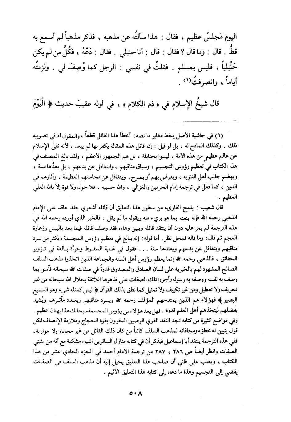 وكذلك المادح له، بل لو قيل: إن قائل هذه المقالة يكفر بها لم يبعد، لأنه نفى الإسلام عن عالم عظيم من هذه الأمة، ليسوا بحنابلة، بل هم الجمهور الأعظم، ولقد بالغ المصنف في هذا الكتاب في تعظيم رؤوس التجسيم، وسياق مناقبهم، والتغافل عن بدعهم، بل يعدها سنة، ويهضم جانب أهل التنزيه، ويعرض بهم أو يصرح، ويتغافل عن محاسنهم العظيمة، وآثارهم في الدين، كما فعل في ترجمة إمام الحرمين والغزالي، والله حسيبه، فلا حول ولا قوة إلا بالله العلي العظيم.