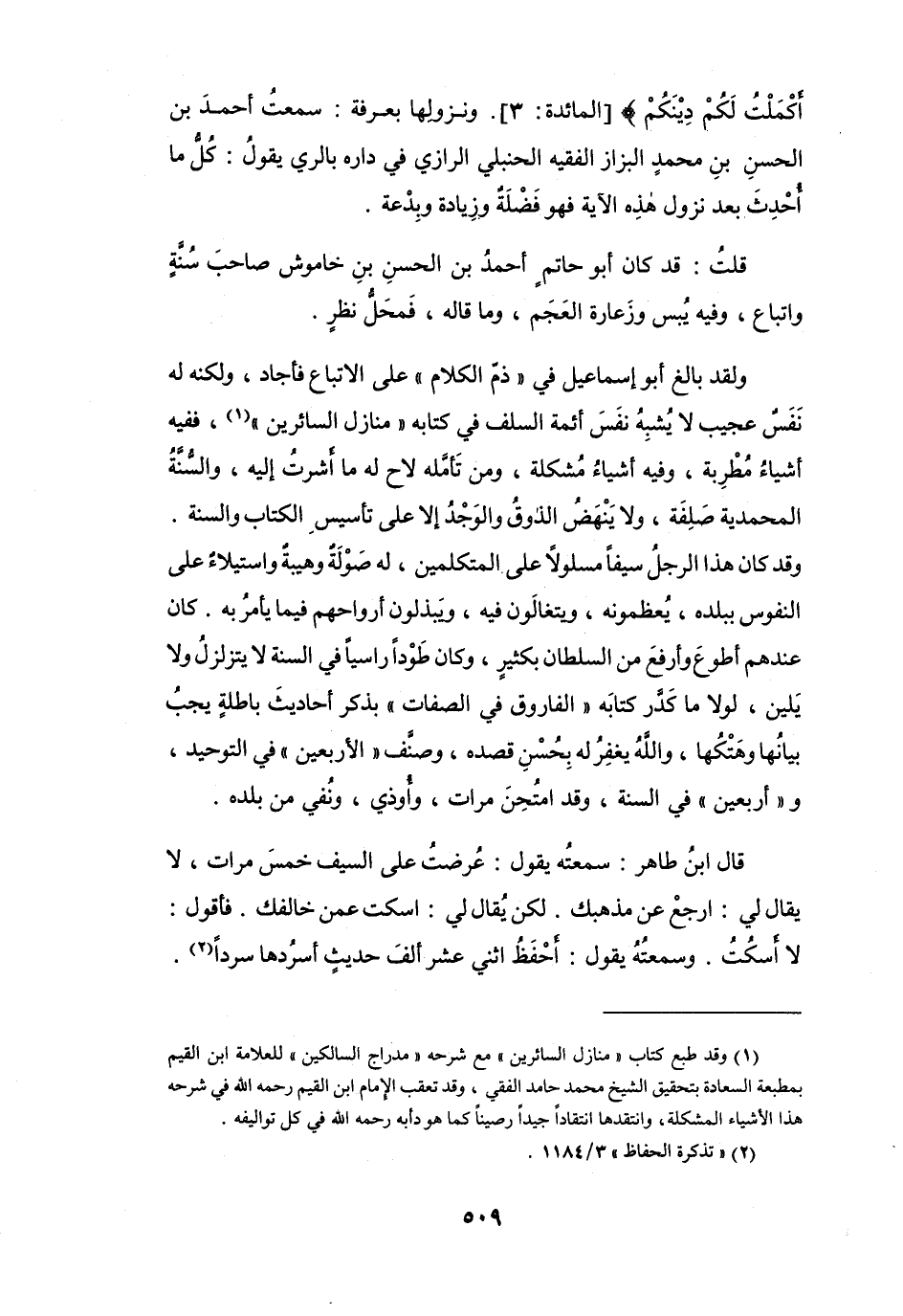 وَلَقَدْ بِالغ أَبُو إِسْمَاعِيْلَ فِي (ذَمِّ الكَلاَمِ) عَلَى الاَتِّبَاع فَأَجَاد، وَلَكِنَّهُ لَهُ نَفْس عَجِيْب لاَ يُشْبِهُ نَفَسَ أَئِمَّة السَّلَف فِي كِتَابِهِ (مَنَازِل السَّائِرِيْنَ (1)) ، فَفِيْهِ أَشيَاءُ مُطْرِبَة، وَفِيْهِ أَشيَاءُ مُشكلَة، وَمَنْ تَأَمَّلَه لاَح لَهُ مَا أَشرتُ إِلَيْهِ، وَالسُّنَّة المحمديَّة صَلِفَة، وَلاَ يَنْهَضُ الذّوقُ وَالوَجْدُ إِلاَّ عَلَى تَأَسيسِ الكِتَاب وَالسّنَّة.