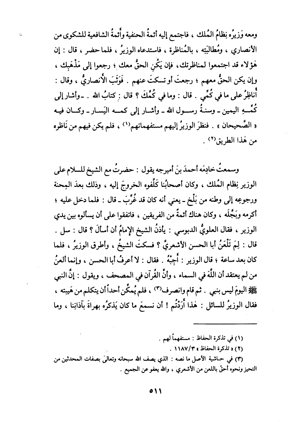 وَسَمِعْتُ خَادِمَه أَحْمَد بن أَمِيْرجه يَقُوْلُ: حضَرتُ مَعَ الشَّيْخ لِلسّلاَم عَلَى الوَزِيْر نِظَام المُلك، وَكَانَ أَصْحَابُنَا كلَّفُوهُ الخُرُوجَ إِلَيْهِ، وَذَلِكَ بَعْد المِحنَة وَرُجُوْعِهِ إِلَى وَطَنه مِنْ بَلْخ - يَعْنِي: أَنَّهُ كَانَ قَدْ غُرِّبَ - قَالَ: فَلَمَّا دَخَلَ عَلَيْهِ؛ أَكرمه وَبجَّلَهُ، وَكَانَ هُنَاكَ أَئِمَّةٌ مِنَ الفَرِيْقَيْنِ، فَاتَّفَقُوا عَلَى أَنْ يَسْأَلُوْهُ بَيْنَ يَدي الوَزِيْر، فَقَالَ العَلَوِيُّ الدبوسِيّ: يَأْذنُ الشَّيْخ الإِمَامُ أَنْ أَسَأَل؟