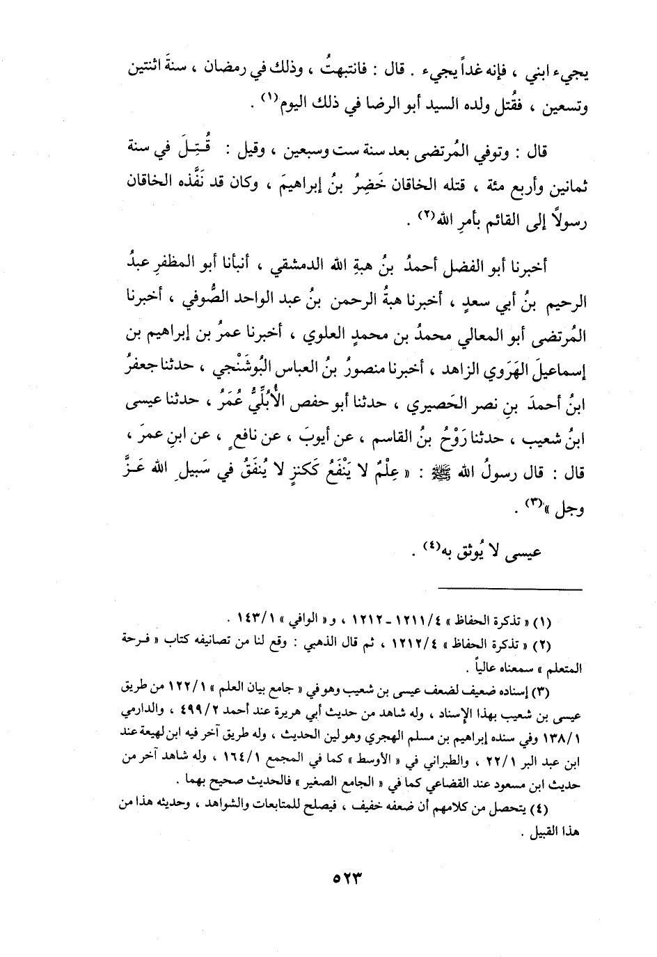 أَخْبَرَنَا أَبُو الفَضْلِ أَحْمَدُ بنُ هِبَةِ اللهِ الدِّمَشْقِيّ، أَنْبَأَنَا أَبُو المظفرِ عَبْدُ الرَّحِيْم بنُ أَبِي سَعْدٍ، أَخْبَرَنَا هبَةُ الرَّحْمَن بنُ عبد الوَاحِد الصُّوْفِيّ، أَخْبَرَنَا المُرْتَضَى أَبُو المَعَالِي مُحَمَّدُ بنُ مُحَمَّدٍ العَلَوِيّ، أَخْبَرَنَا عُمَرُ بنُ إِبْرَاهِيْمَ بنِ إِسْمَاعِيْلَ الهَرَوِيّ الزَّاهِد، أَخْبَرَنَا مَنْصُوْرُ بنُ العَبَّاسِ البُوْشَنْجِيّ، حَدَّثَنَا جَعْفَرٌ بنُ أَحْمَدَ بنِ نَصْر الحَصِيْرِيّ، حَدَّثَنَا أَبُو حَفْصٍ الأُبُلِّيُّ عُمَرُ، حَدَّثَنَا عِيْسَى بنُ شُعَيْبٍ، حَدَّثَنَا رَوْحُ بنُ القَاسِمِ، عَنْ أَيُّوْبَ، عَنْ نَافِعٍ، عَنِ ابْنِ عُمَرَ قَالَ: