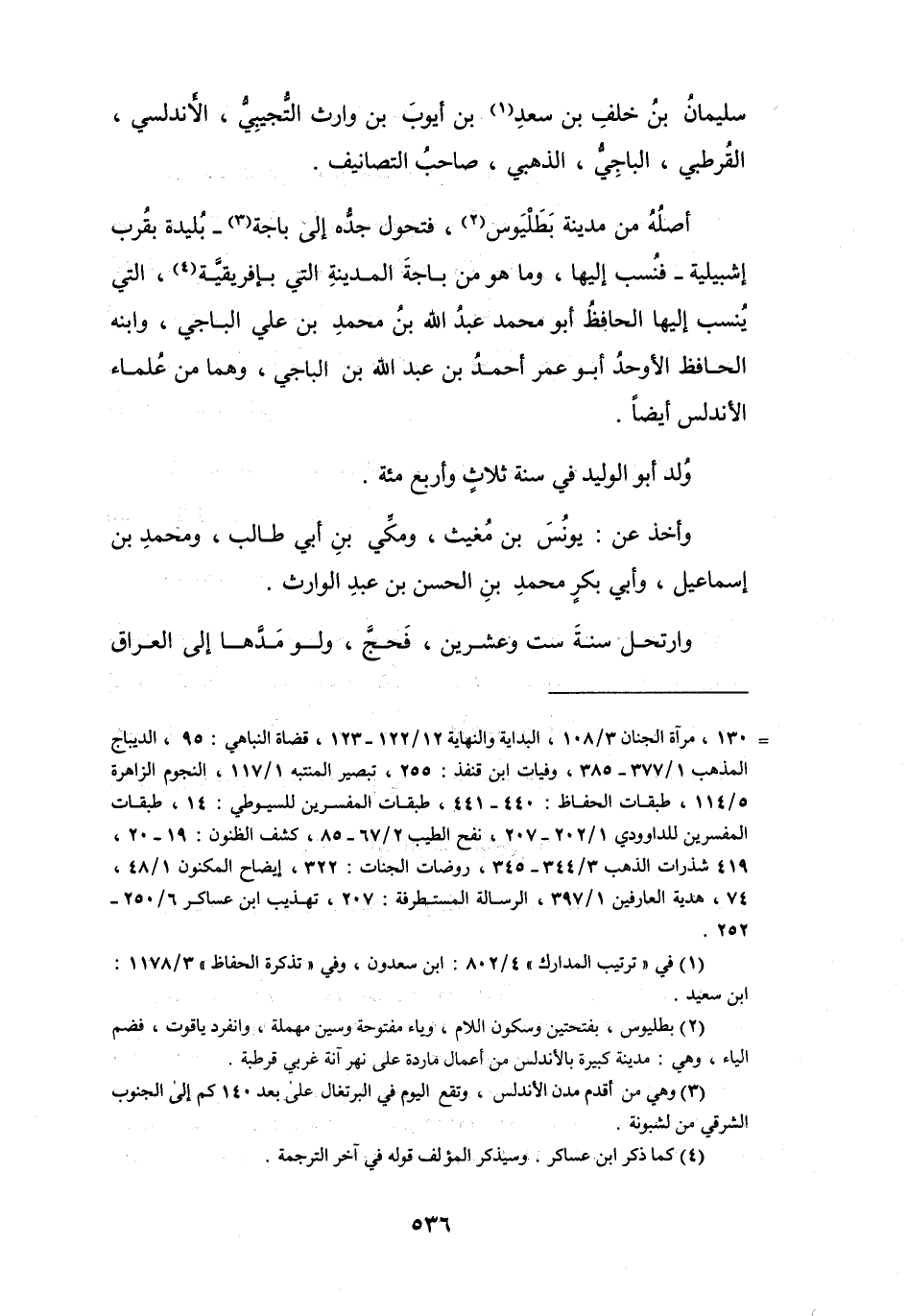 سُلَيْمَانُ بنُ خَلَفِ بنِ سَعْدِ (1) بنِ أَيُّوْبَ بنِ وَارِث التُّجِيْبِيُّ، الأَنْدَلُسِيُّ، القُرْطُبِيُّ، البَاجِيُّ، الذَّهَبِيُّ، صَاحِبُ التَّصَانِيْفِ.