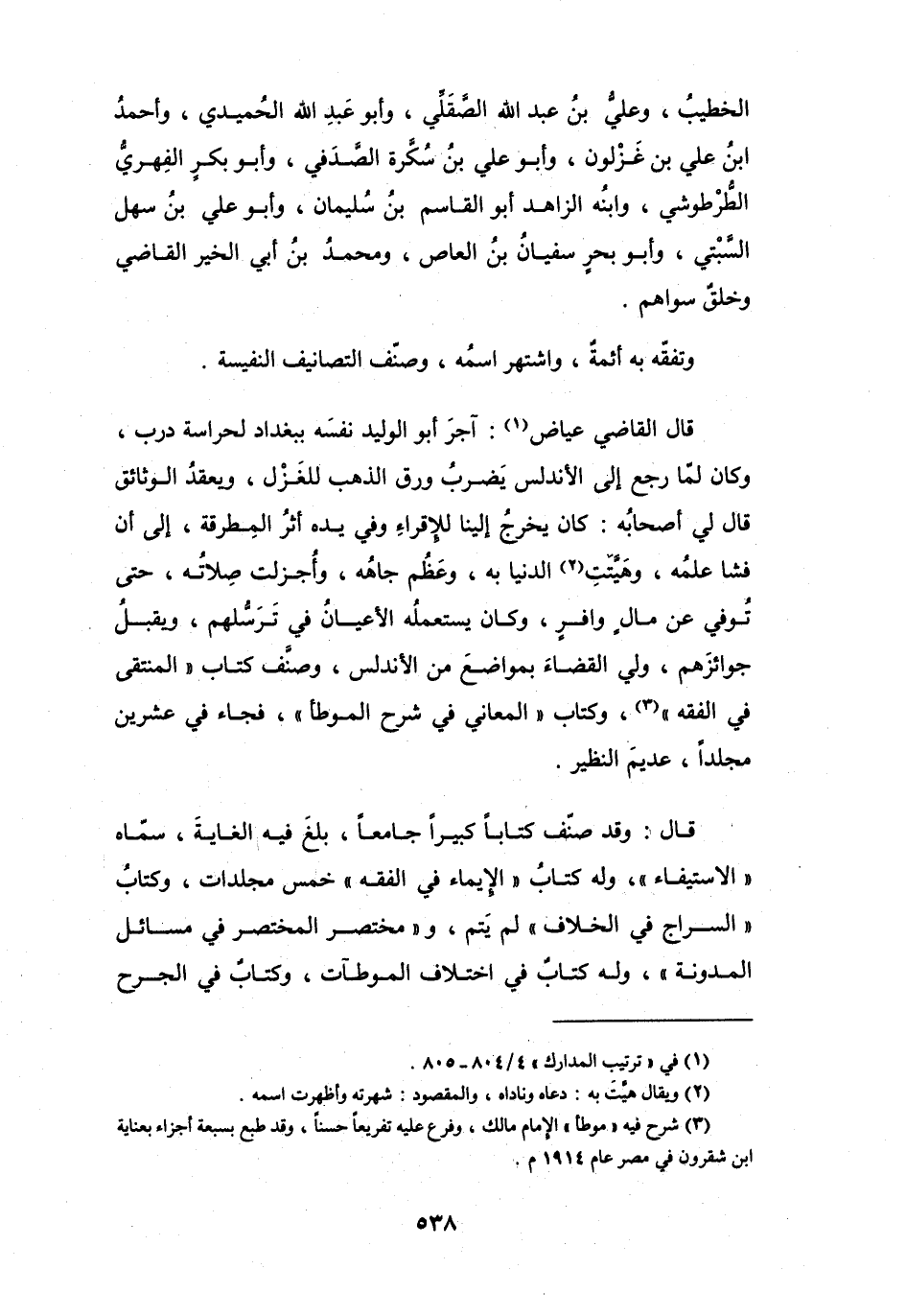 (3) شرح فيه " موطأ " الامام مالك، وفرع عليه تفريعا حسنا، وقد طبع بسبعة أجزاء بعناية ابن شقرون في مصر عام 1914 م.