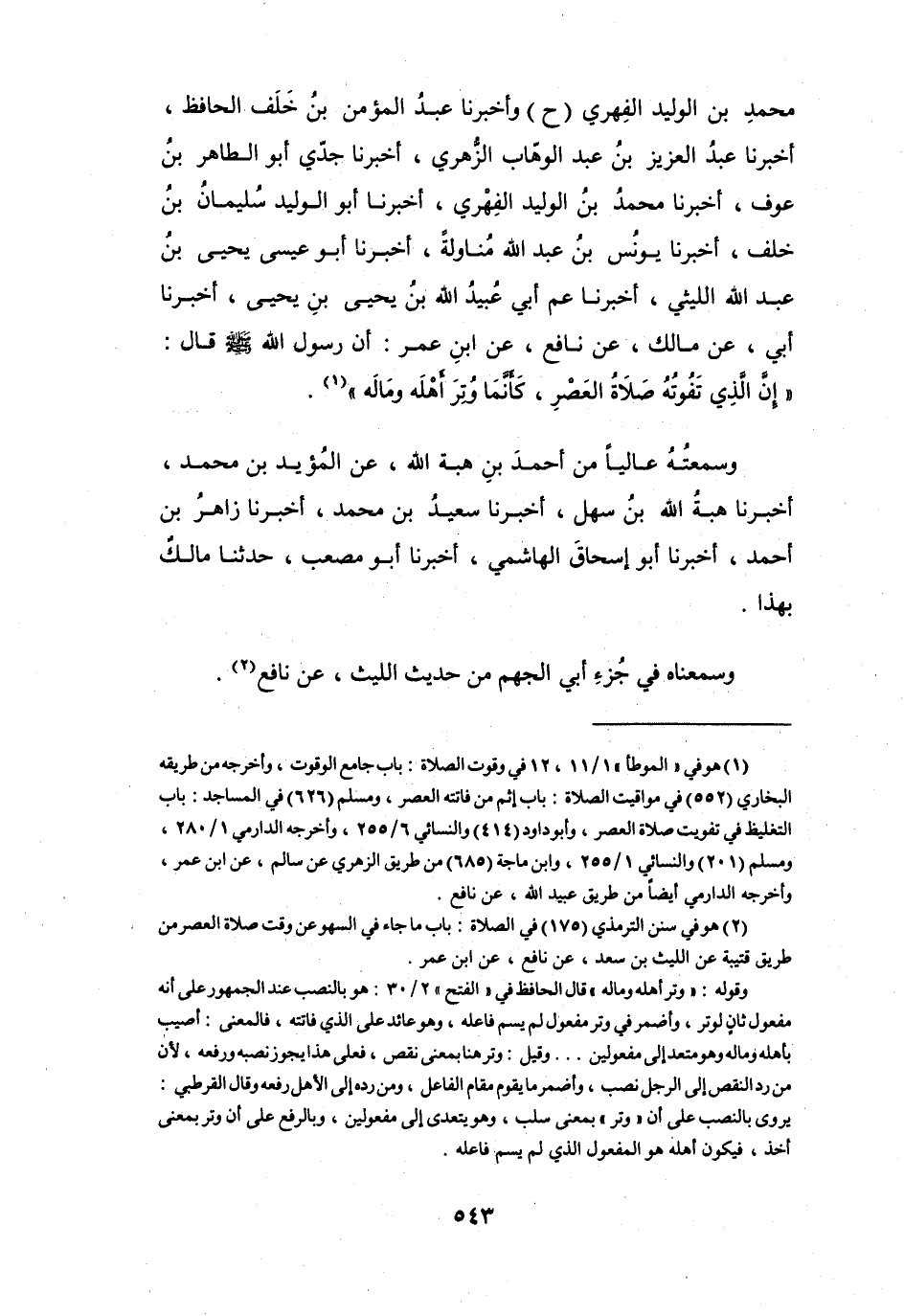 (2) هو في سنن الترمذي (175) في الصلاة: باب ما جاء في السهو عن وقت صلاة العصر من طريق قتيبة عن الليث بن سعد، عن نافع، عن ابن عمر.