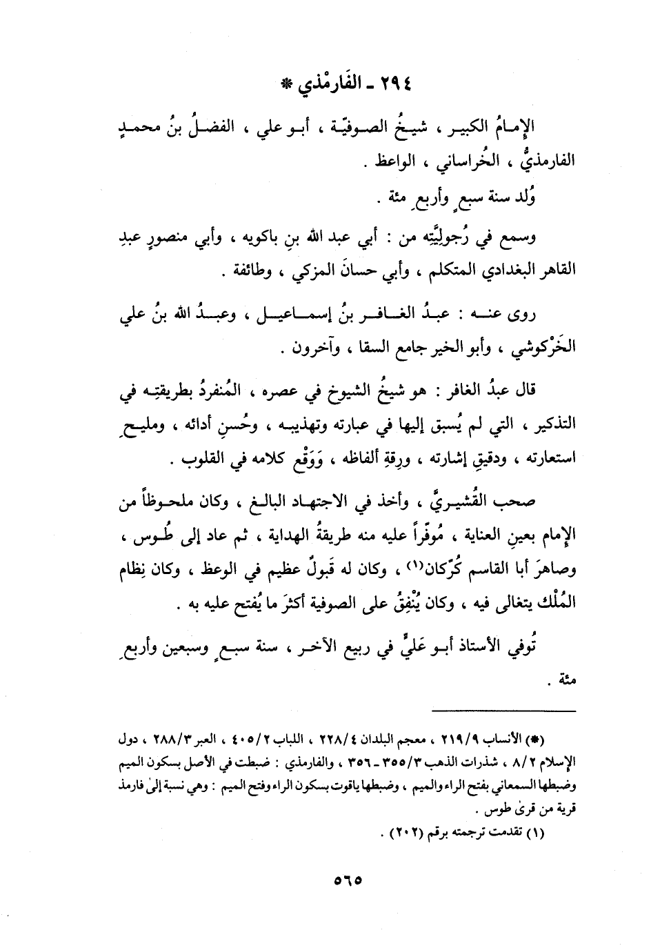 (*) الأنساب 9 / 219، معجم البلدان 4 / 228، اللباب 2 / 405، العبر 3 / 288، دول الإسلام 2 / 8، شذرات الذهب 3 / 355 - 356، والفارمذي: ضبطت في الأصل بسكون الميم وضبطها السمعاني بفتح الراء والميم، وضبطها ياقوت بسكون الراء وفتح الميم: وهي نسبة إلى فارمذ قرية من قرى طوس.