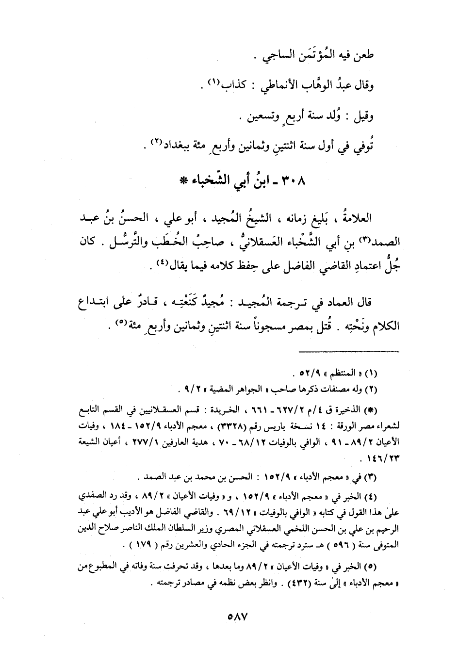 (5) الخبر في " وفيات الأعيان " 2 / 89 وما بعدها، وقد تحرفت سنة وفاته في المطبوع من " معجم الأدباء " إلى سنة (432) . وانظر بعض نظمه في مصادر ترجمته.