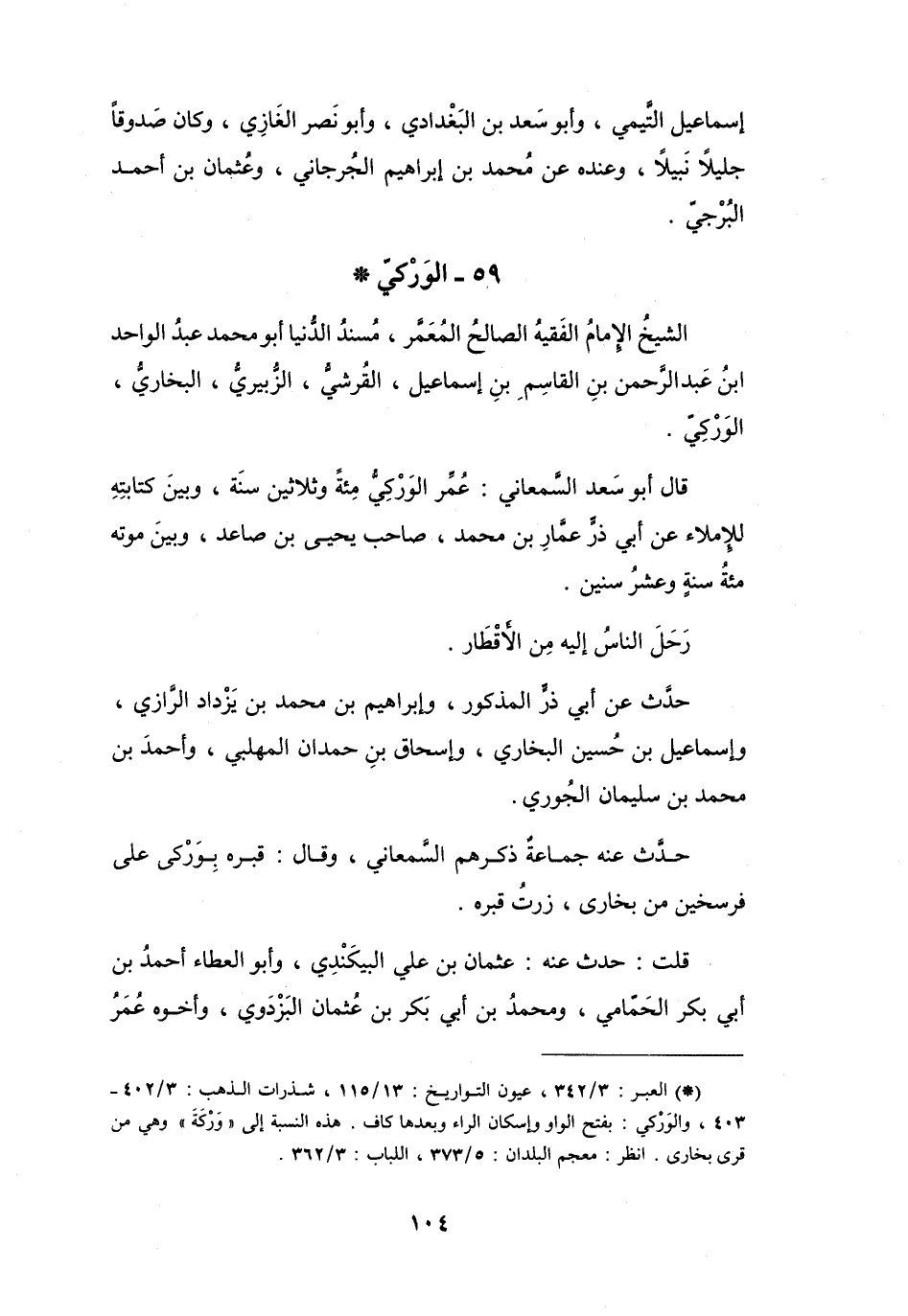 (*) العبر: 3 / 342، عيون التواريخ: 13 / 115، شذرات الذهب 3 / 402 - 403، والوركي: بفتح الواو وإسكان الراء وبعدها كاف. هذه النسبة إلى " وركة " وهي من قرى بخارى. أنظر: معجم البلدان: 5 / 373، اللباب: 3 / 362.
