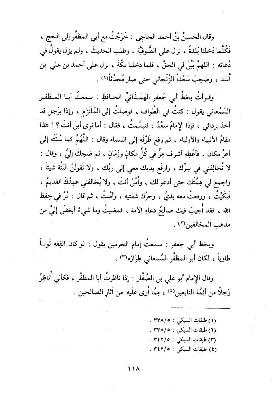 وَقَالَ الحُسَيْنُ بنُ أَحْمَدَ الحَاجِي: خَرَجتُ مَعَ أَبِي المُظَفَّر إِلَى الحَجِّ، فَكُلَّمَا دخلنَا بَلَدَةً، نَزل عَلَى الصُّوْفِيَّة، وَطَلَبَ الحَدِيْثَ، وَلَمْ يَزَلْ يَقُوْلُ فِي دُعَائِهِ: اللَّهُمَّ بَيِّنْ لِيَ الحَقَّ، فَلَمَّا دَخلنَا مَكَّةَ، نَزلَ عَلَى أَحْمَدَ بنِ عَلِيِّ بن أَسَدٍ، وَصَحِبَ سَعْداً الزَّنْجَانِي حَتَّى صَارَ مُحَدِّثاً (1) .