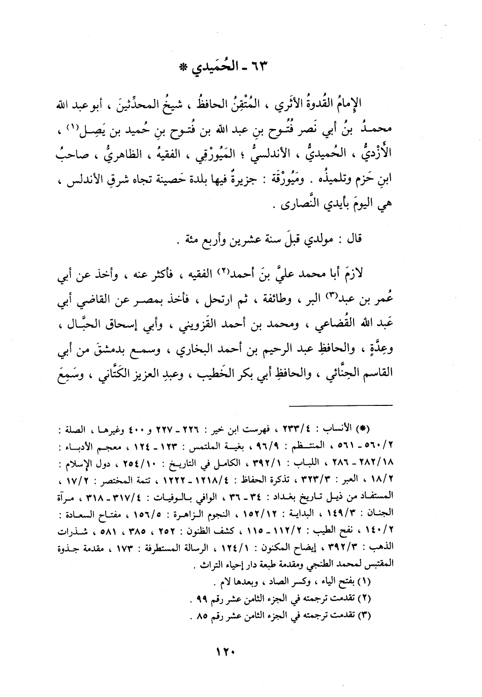 (*) الأنساب: 4 / 233، فهرست ابن خير: 226 - 227 و400 وغيرها، الصلة: 2 / 560 - 561، المنتظم: 9 / 96، بغية الملتمس: 123 - 124، معجم الأدباء: 18 / 282 - 286، اللباب: 1 / 392، الكامل في التاريخ: 10 / 254، دول الإسلام: 2 / 18، العبر: 3 / 323، تذكرة الحفاظ: 4 / 1218 - 1222، تتمة المختصر: 2 / 17، المستفاد من ذيل تاريخ بغداد: 34 - 36، الوافي بالوفيات: 4 / 317 - 318، مرآة الجنان: 3 / 149، البداية: 12 / 152، النجوم الزاهرة: 5 / 156، مفتاح السعادة: 2 / 140، نفح الطيب: 2 / 122 - 115، كشف الظنون: 252، 385، 581، شذرات الذهب: 3 / 392، إيضاح المكنون: 1 / 124، الرسالة المستطرفة: 173، مقدمة جذوة المقتبس لمحمد الطنجي ومقدمة طبعة دار إحياء التراث.