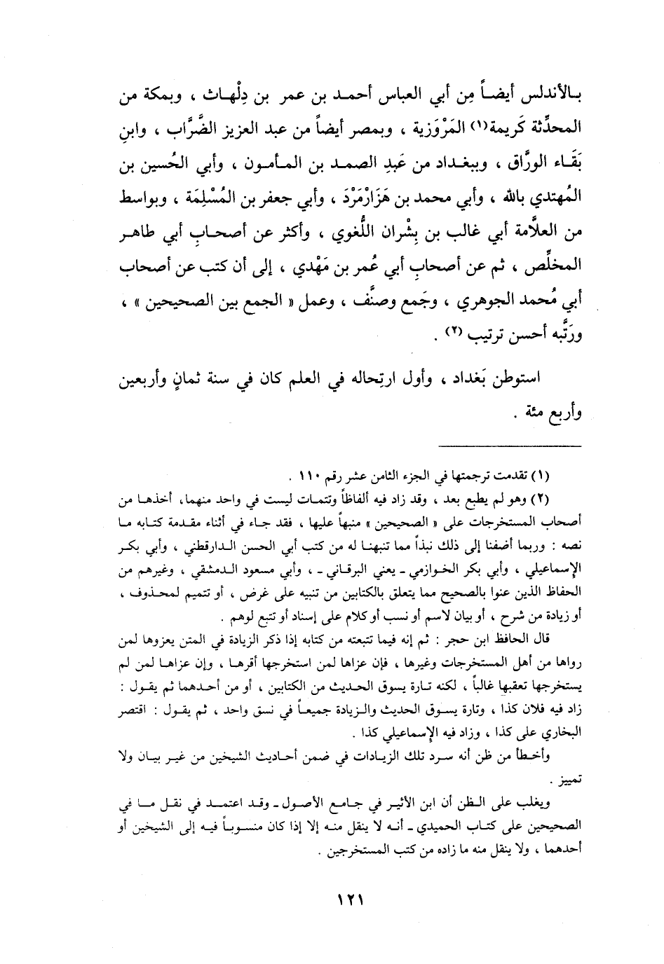 ويغلب على الظن أن ابن الأثير في جامع الأصول - وقد اعتمد في نقل ما في الصحيحين على كتاب الحميدي - أنه لا ينقل منه إلا إذا كان منسوبا فيه إلى الشيخين أو أحدهما، ولا ينقل منه ما زاده من كتب المستخرجين.