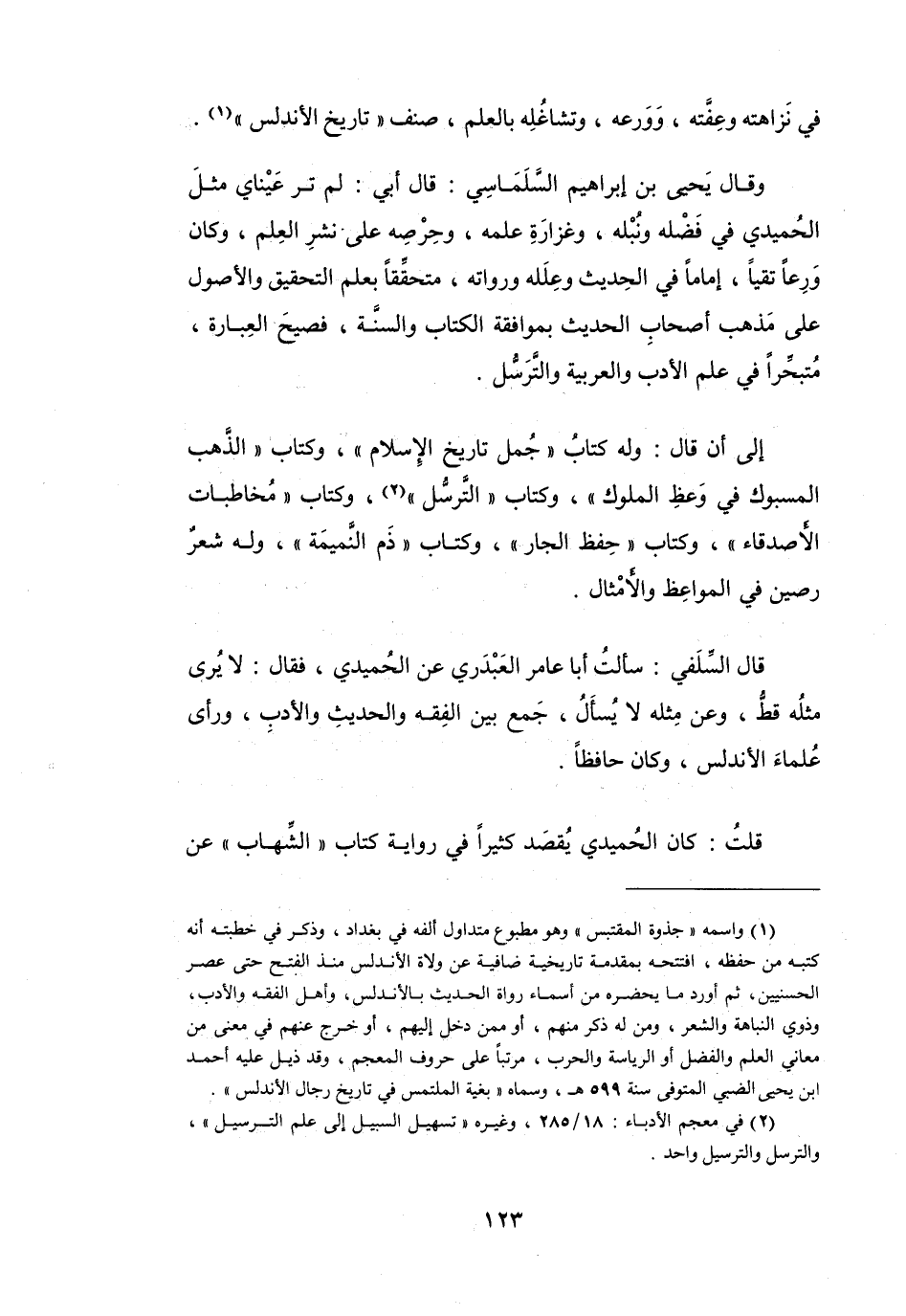 (1) واسمه (جذوة المقتبس) وهو مطبوع متداول ألفه في بغداد، وذكر في خطبته أنه كتبه من حفظه، افتتحه بمقدمة تاريخية ضافية عن ولاة الأندلس منذ الفتح حتى عصر الحسنيين، ثم أورد ما يحضره من أسماء رواة الحديث بالاندلس، وأهل الفقه والأدب، وذوي النباهة والشعر، ومن له ذكر منهم، أو ممن دخل إليهم، أو خرج عنهم في معنى من معاني العلم والفضل أو الرياسة والحرب، مرتبا على حروف المعجم، وقد ذيل عليه أحمد ابن يحيى الضبي المتوفي سنة 599 هـ، وسماه (بغية الملتمس في تاريخ رجال الأندلس) .
