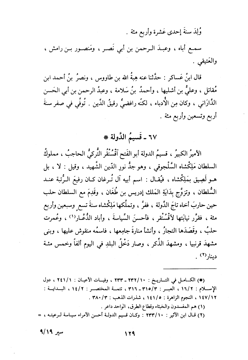 67 - قَسِيمُ الدَّوْلَةِ أَبُو الفَتْحِ آقْسُنْقُرُ التُّركِيُّ الحَاجِبُ *