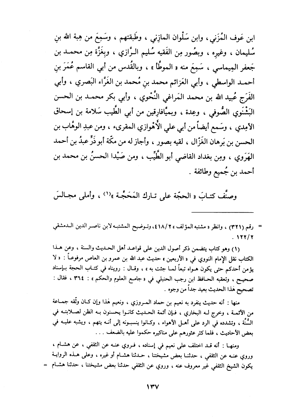 وَصَنَّفَ كِتَاب (الحُجَّةِ عَلَى تَاركِ المَحَجَّةِ (1)) ، وَأَملَى مَجَالِسَ