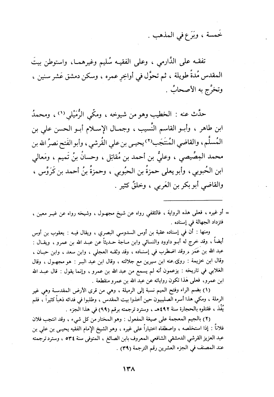 (2) بالجيم المعجمة على صيغة المفعول: وهو المختار من كل شيء، وقد انتجب فلان فلانا: إذا استخلصه، واصطفاه اختيارا على غيره، وهو الشيخ الامام الفقيه يحيى بن علي بن عبد العزيز القرشي الدمشقي الشافعي المعروف بابن الصائغ، المتوفى سنة 534، وسترد ترجمته عند المصنف في الجزء العشرين رقم الترجمة (39) .