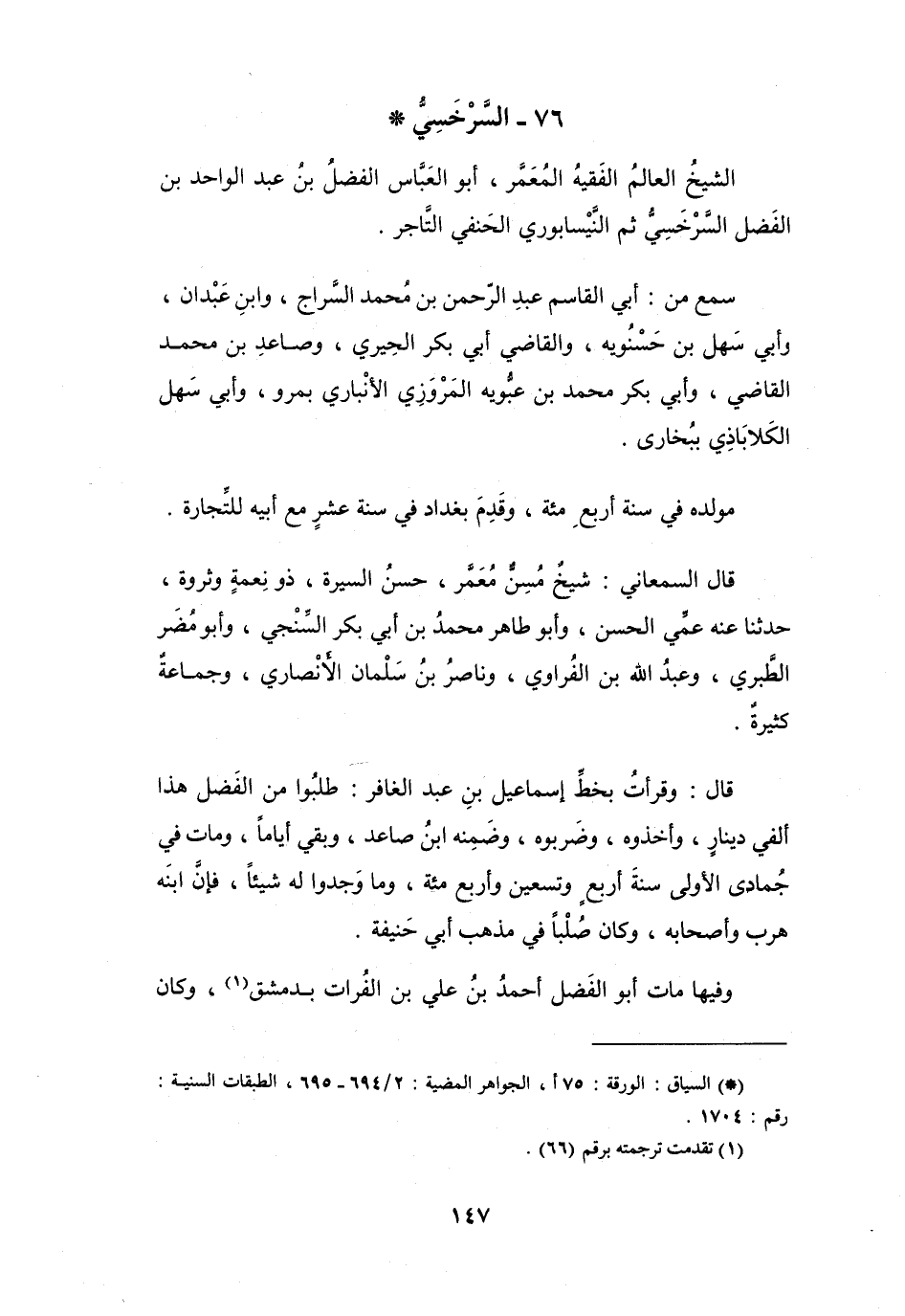 76 - السَّرْخَسيُّ الفَضْلُ بنُ عَبْدِ الوَاحِدِ بنِ الفَضْلِ *