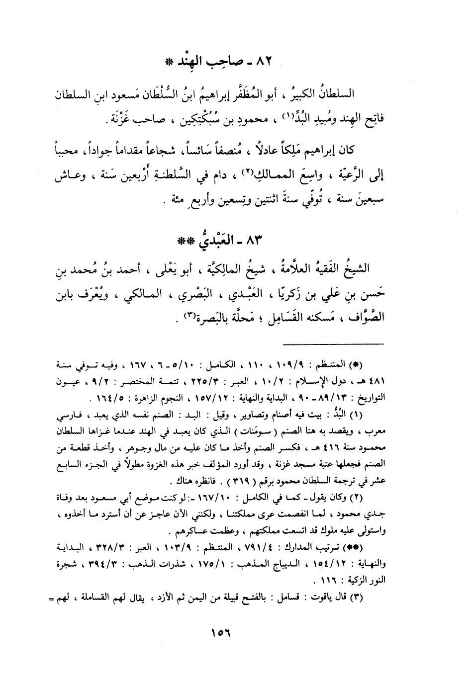 (1) البد: بيت فيه أصنام وتصاوير، وقيل: البد: الصنم نفسه الذي يعبد، فارسي معرب، ويقصد به هنا الصنم (سومنات) الذي كان يعبد في الهند عندما غزاها السلطان محمود سنة 416 هـ، فكسر الصنم وأخذ ما كان عليه من مال وجوهر، وأخذ قطعة من الصنم فجعلها عتبة مسجد غزنة، وقد أورد المؤلف خبر هذه الغزوة مطولا في الجزء السابع عشر في ترجمة السلطان محمود برقم (319) . فانظره هناك.