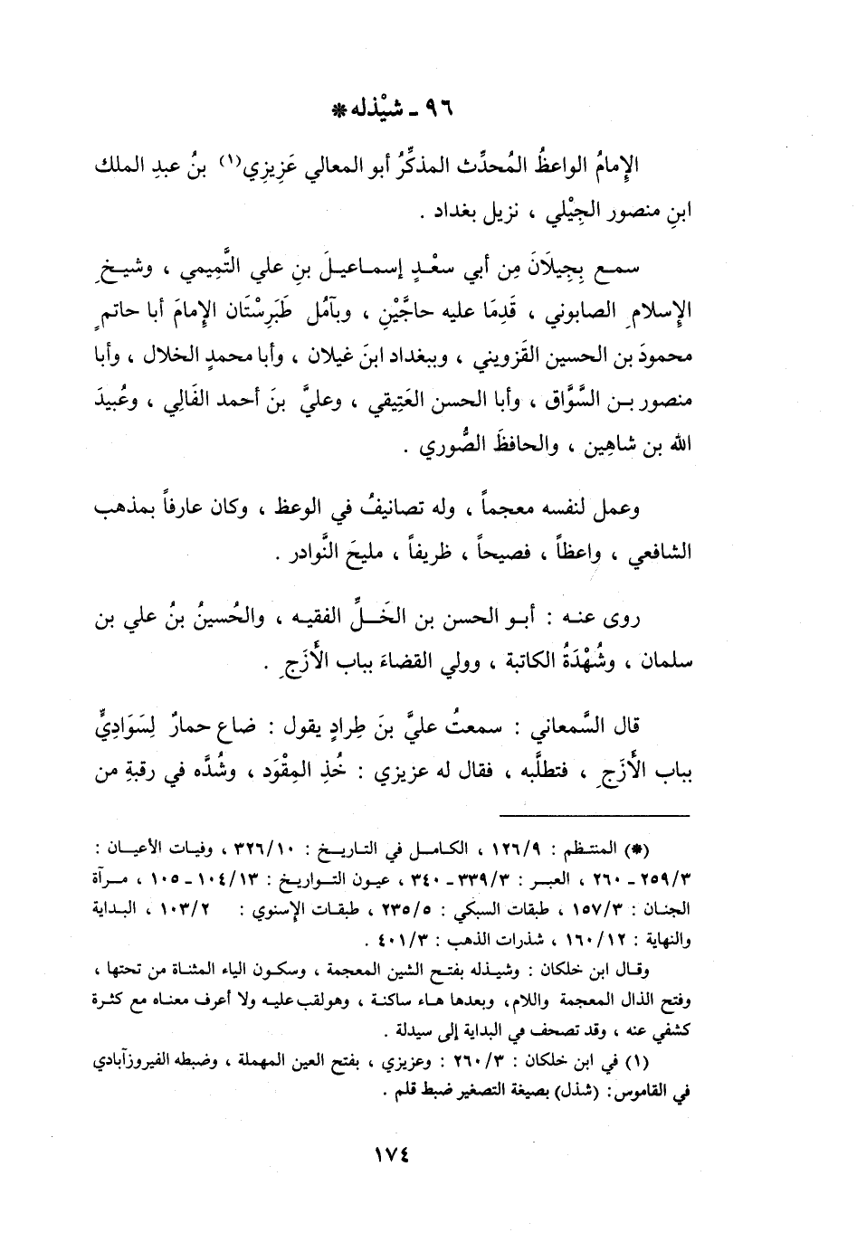 (1) في ابن خلكان: 3 / 260: وعزيزي، بفتح العين المهملة، وضبطه الفيروزآبادي في القاموس: (شذل) بصيغة التصغير ضبط قلم.